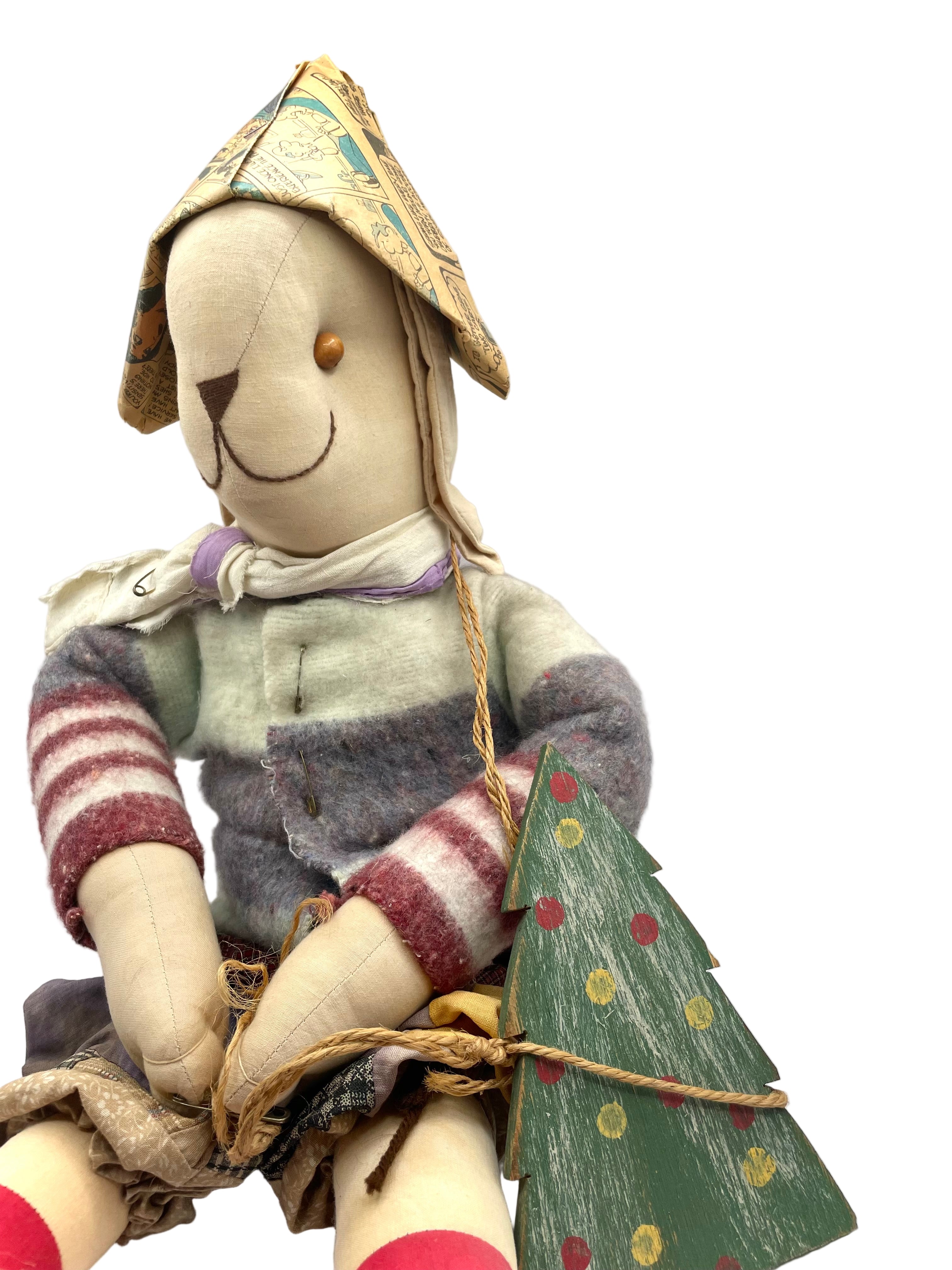 - Accessories: The doll has a hat made from paper comics and holds a small, flat, painted wooden Christmas tree.