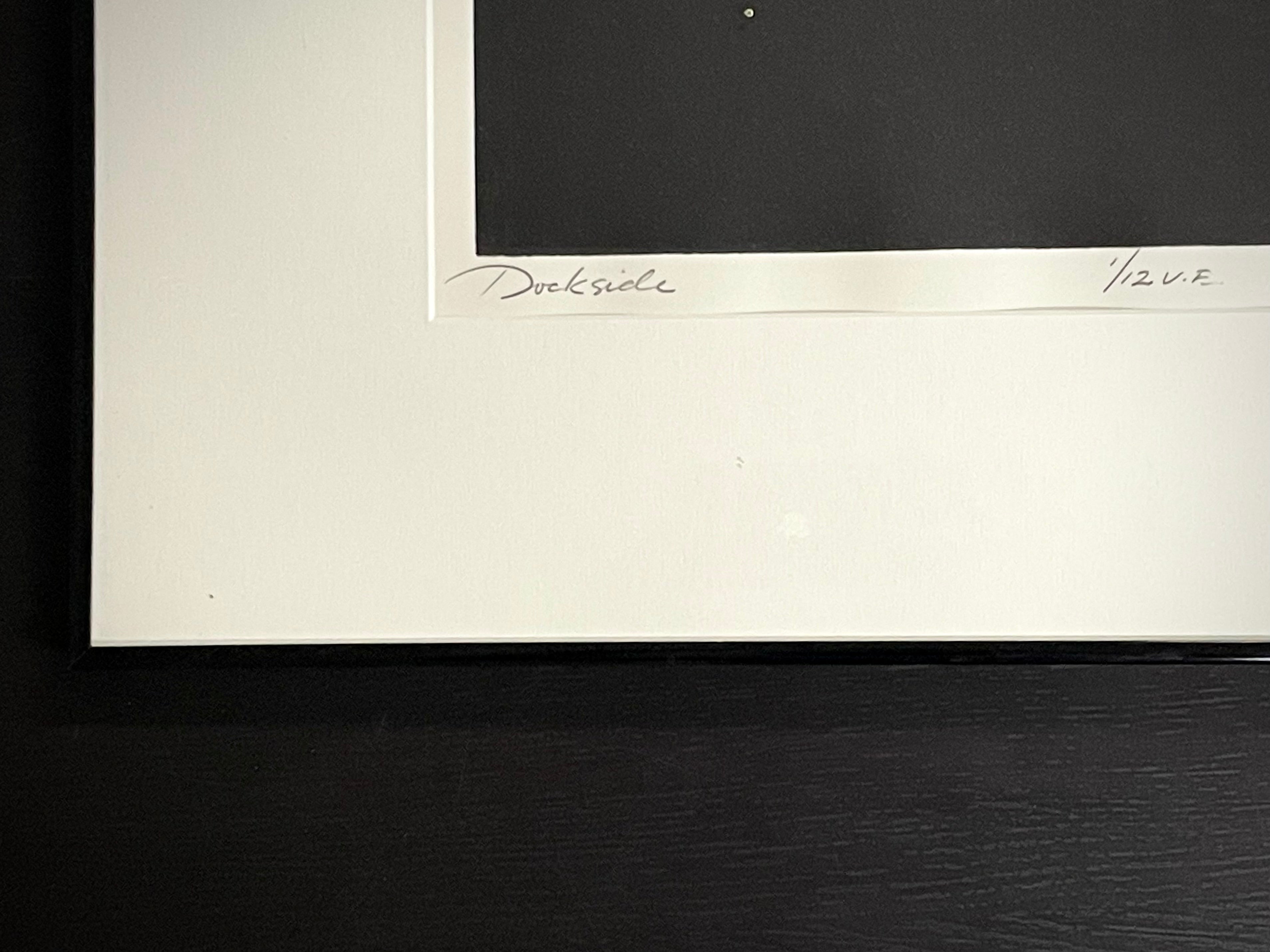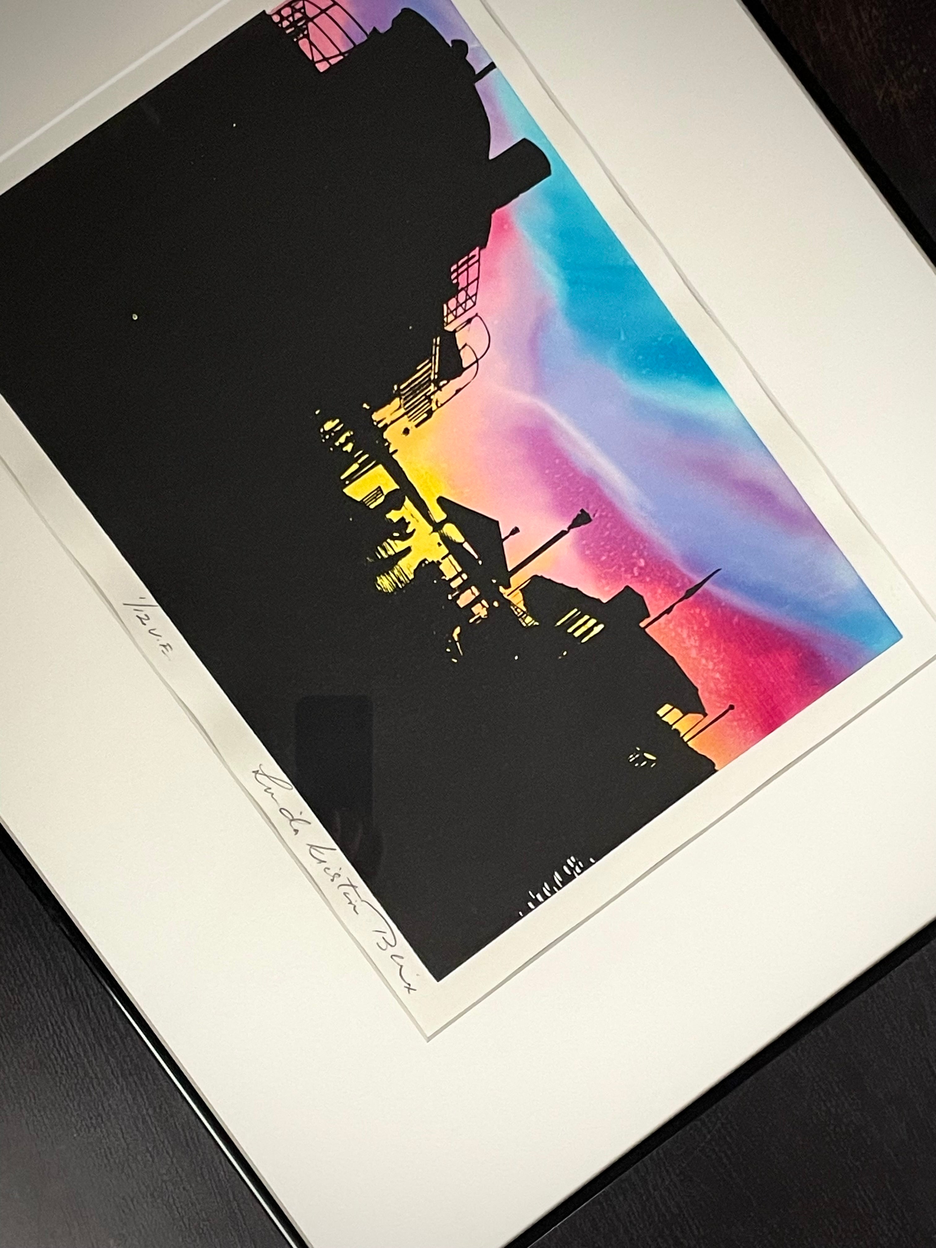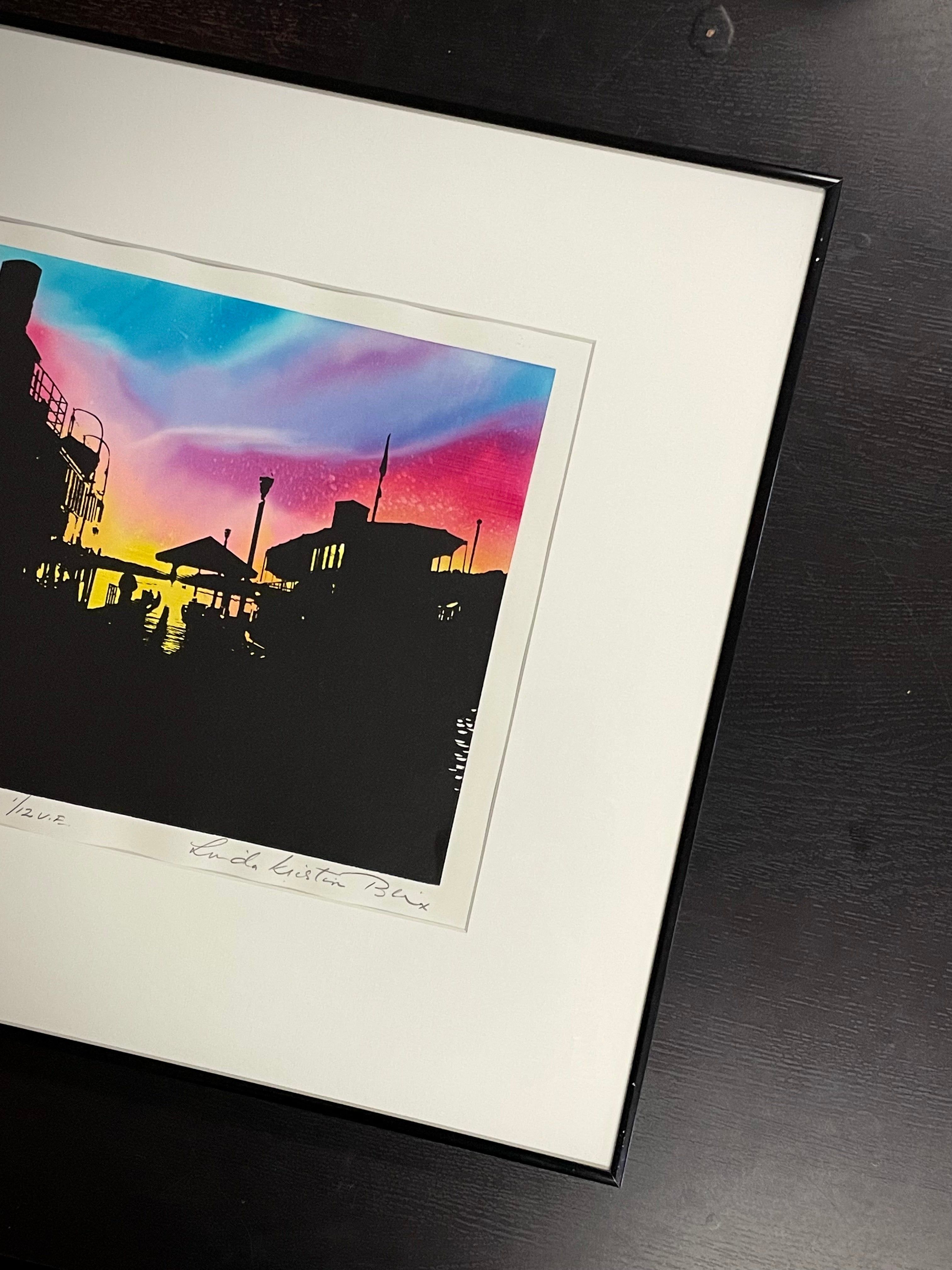 • The artwork is a print of a dockside at sunset or sunrise, with the foreground objects appearing as black silhouettes.