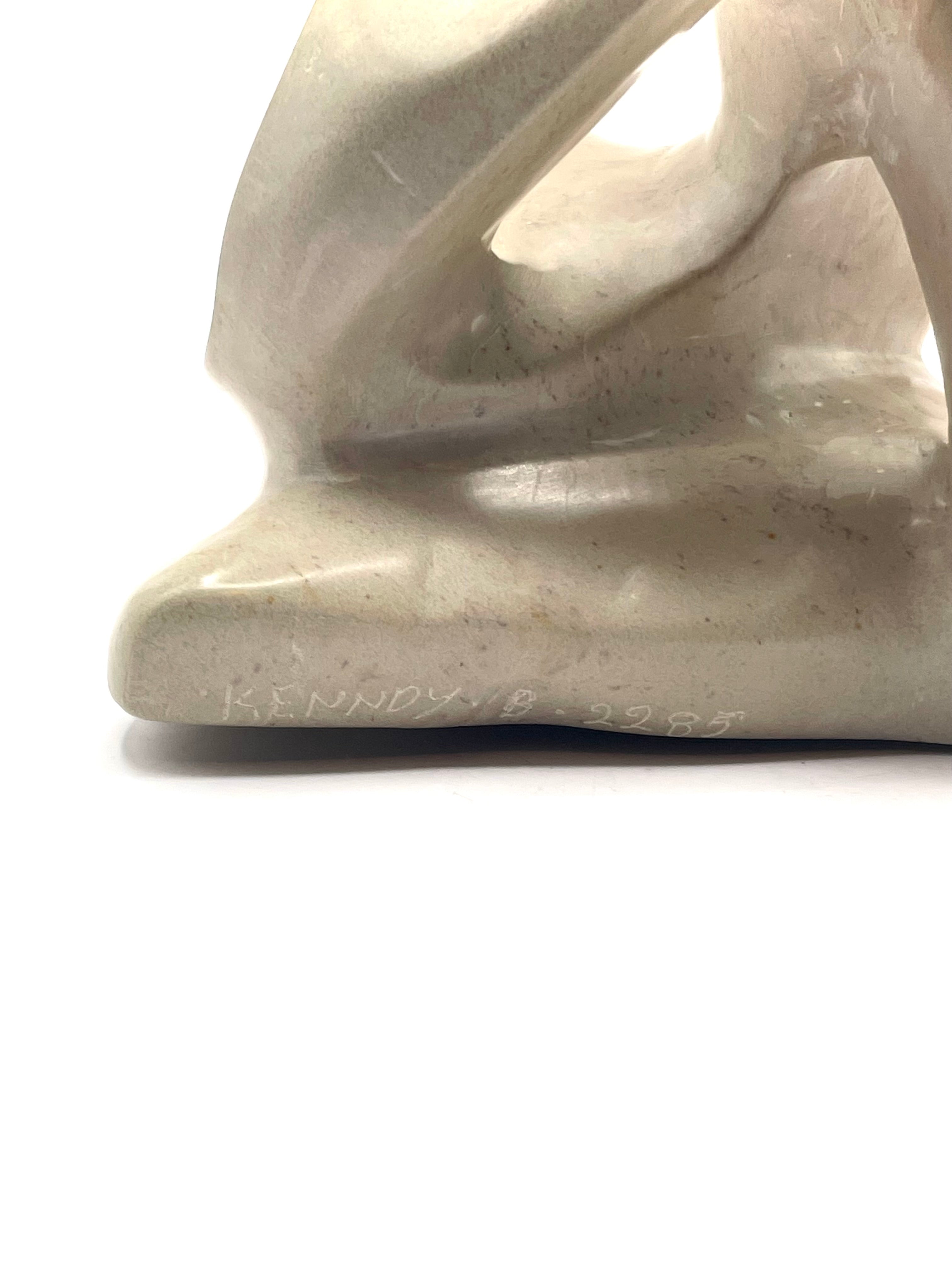 - Material and Finish: It is made of carved stone, likely soapstone, common materials for this style of abstract sculpture. The surface has a smooth, polished finish that reflects light and highlights the contours of the piece, contrasting with the natural, raw texture of the stone.