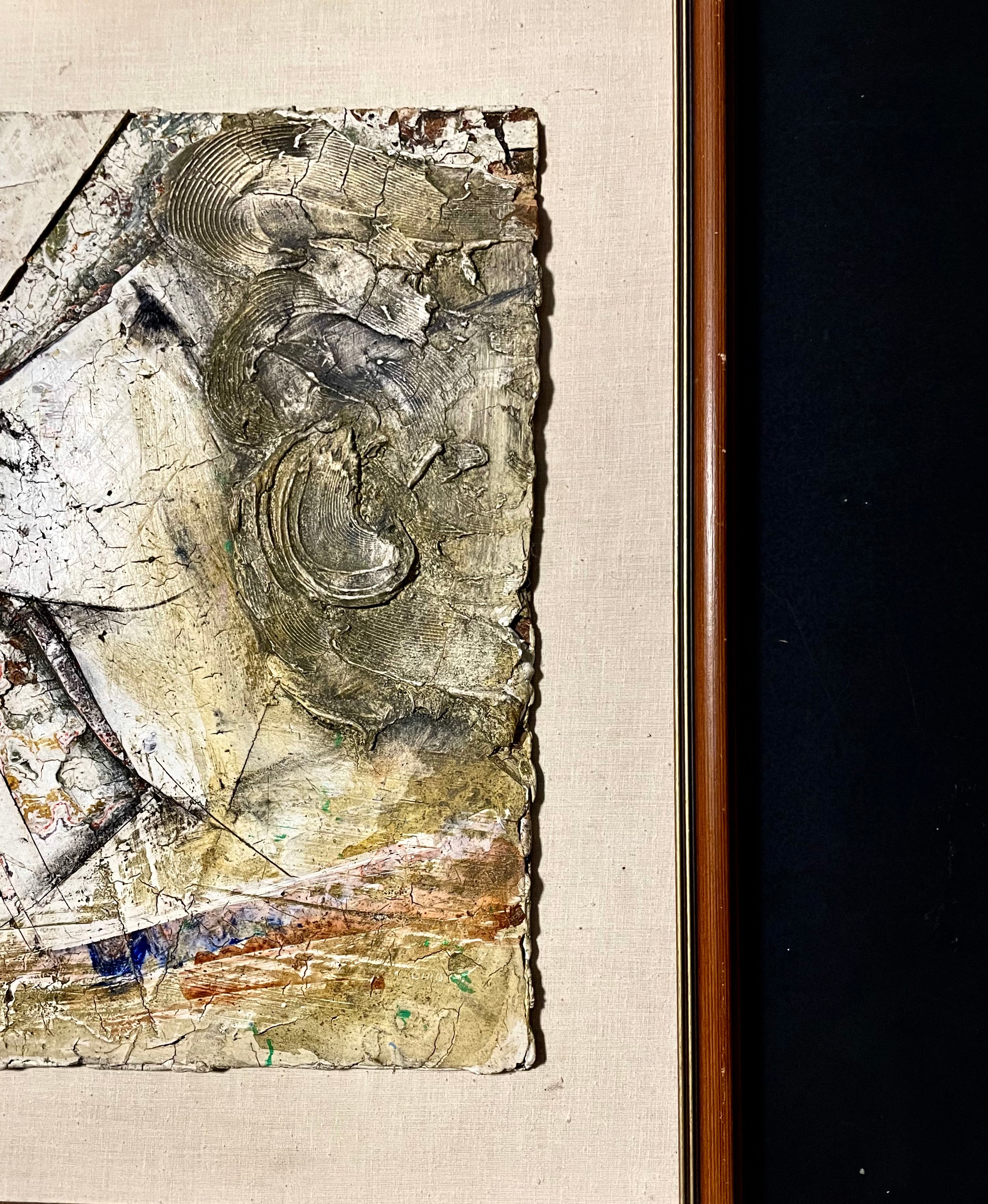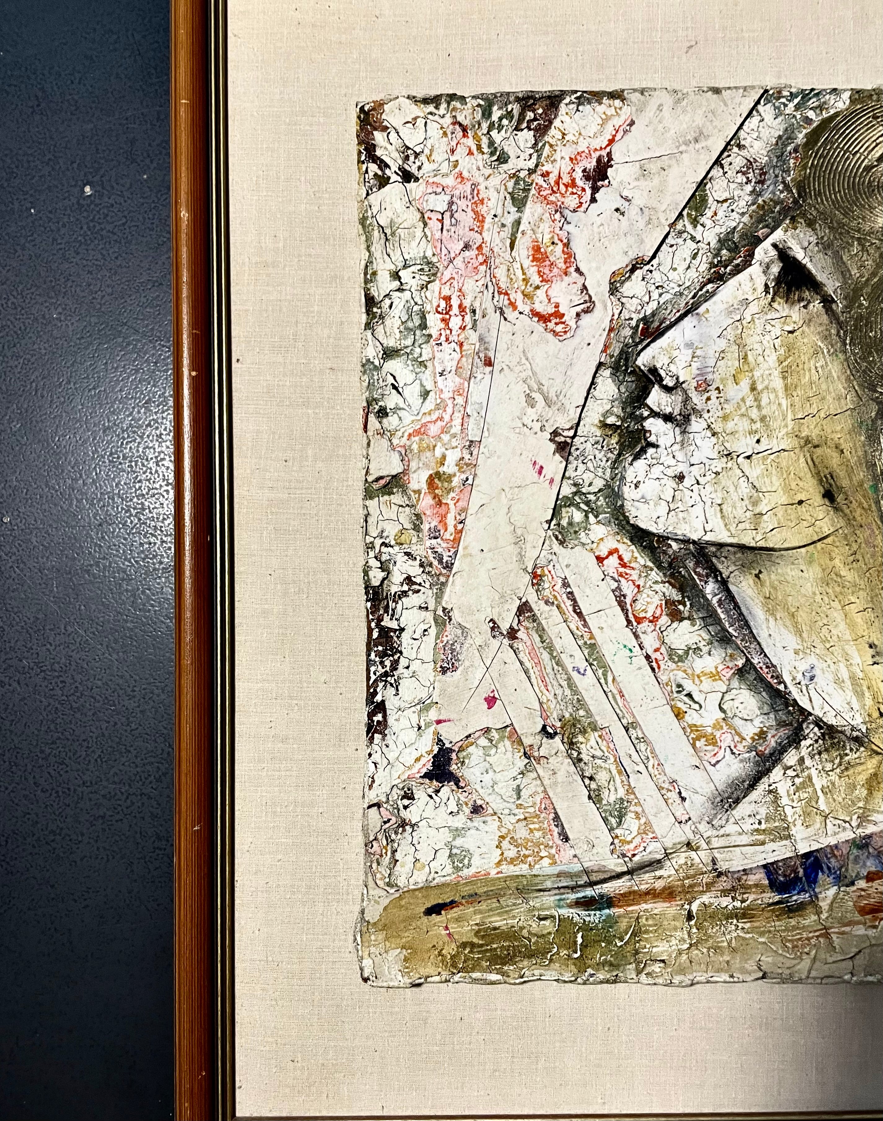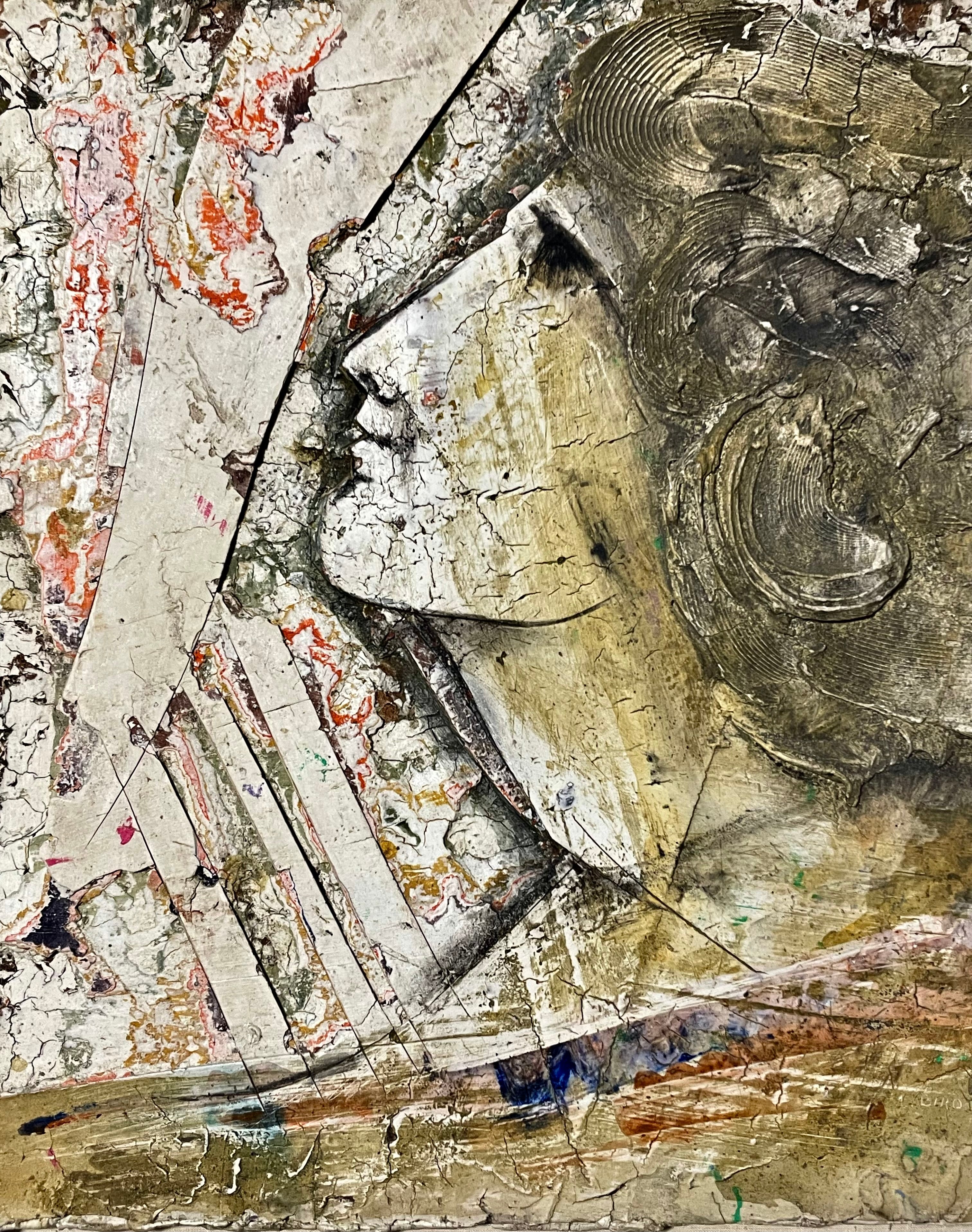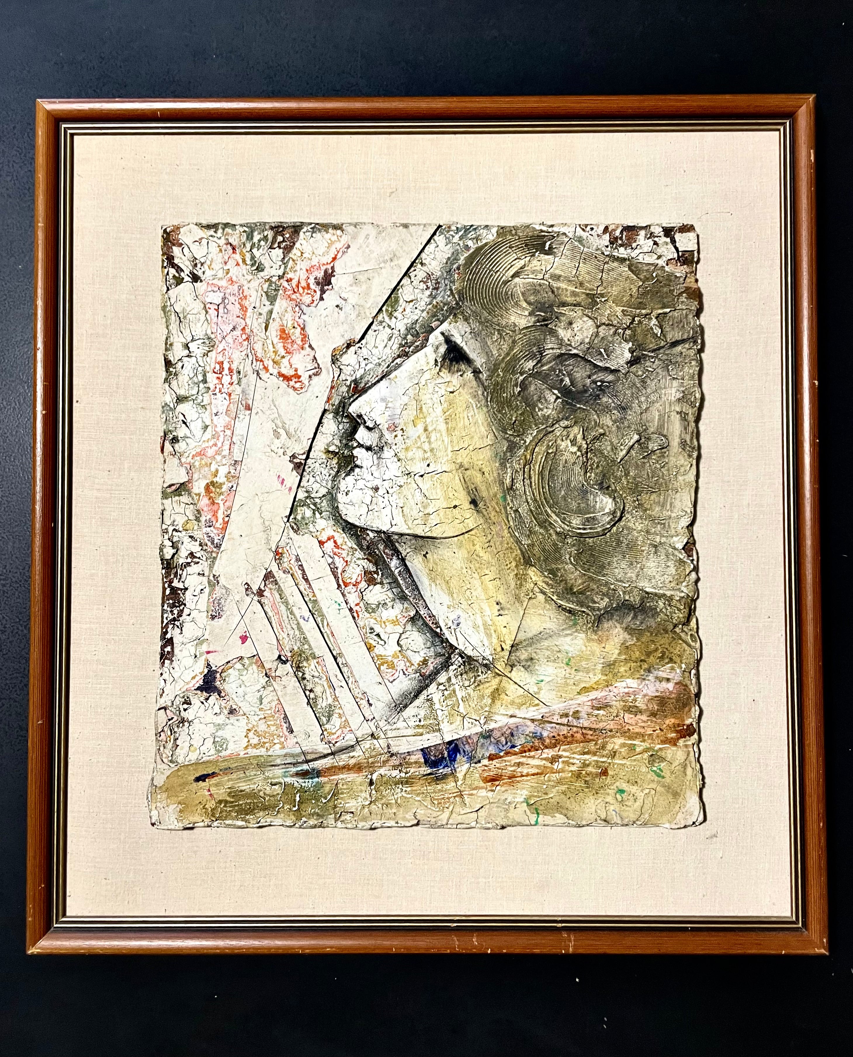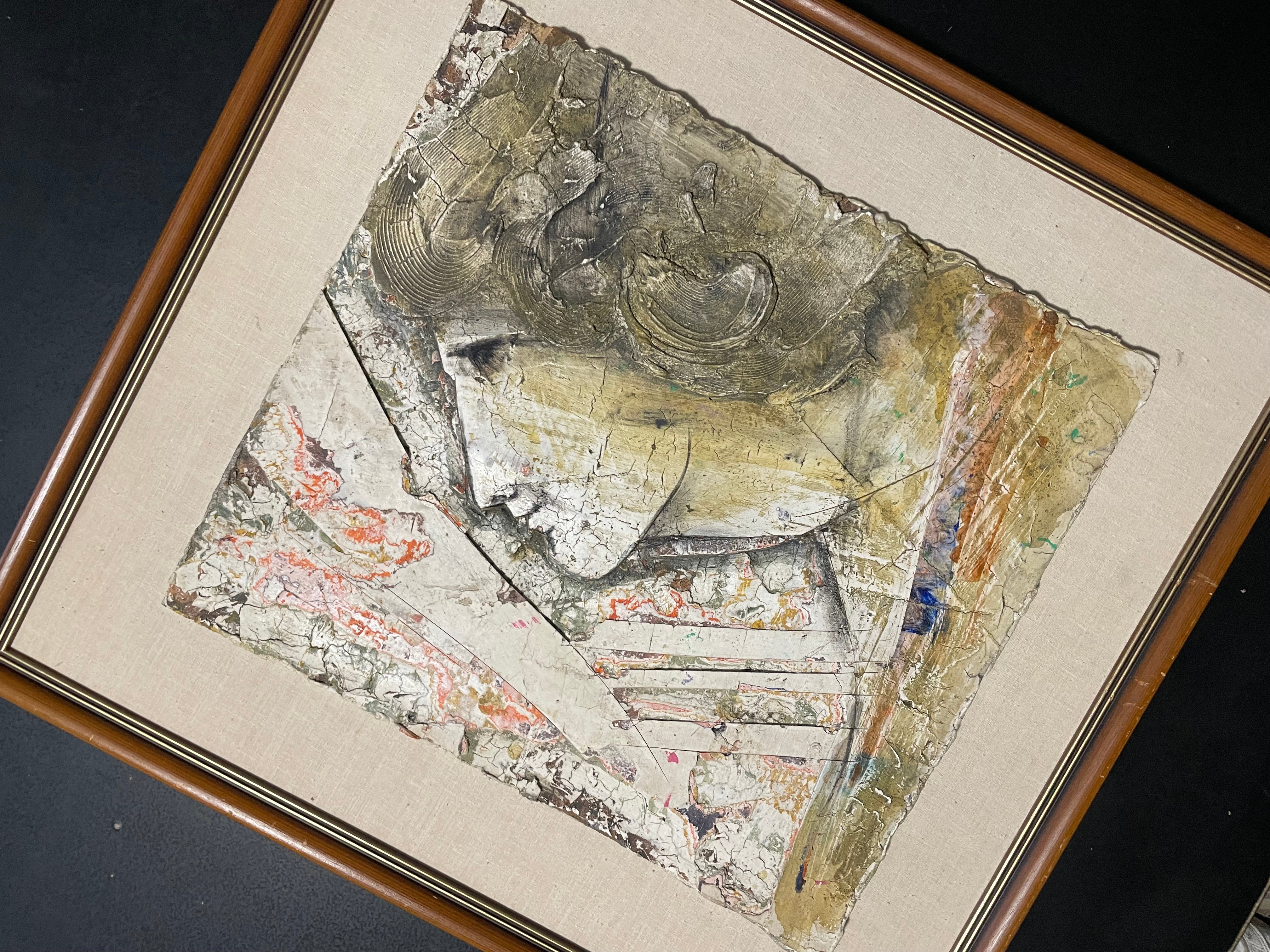 - Textured Abstract Artwork. Mixed-media piece featuring a stylized profile of a woman.