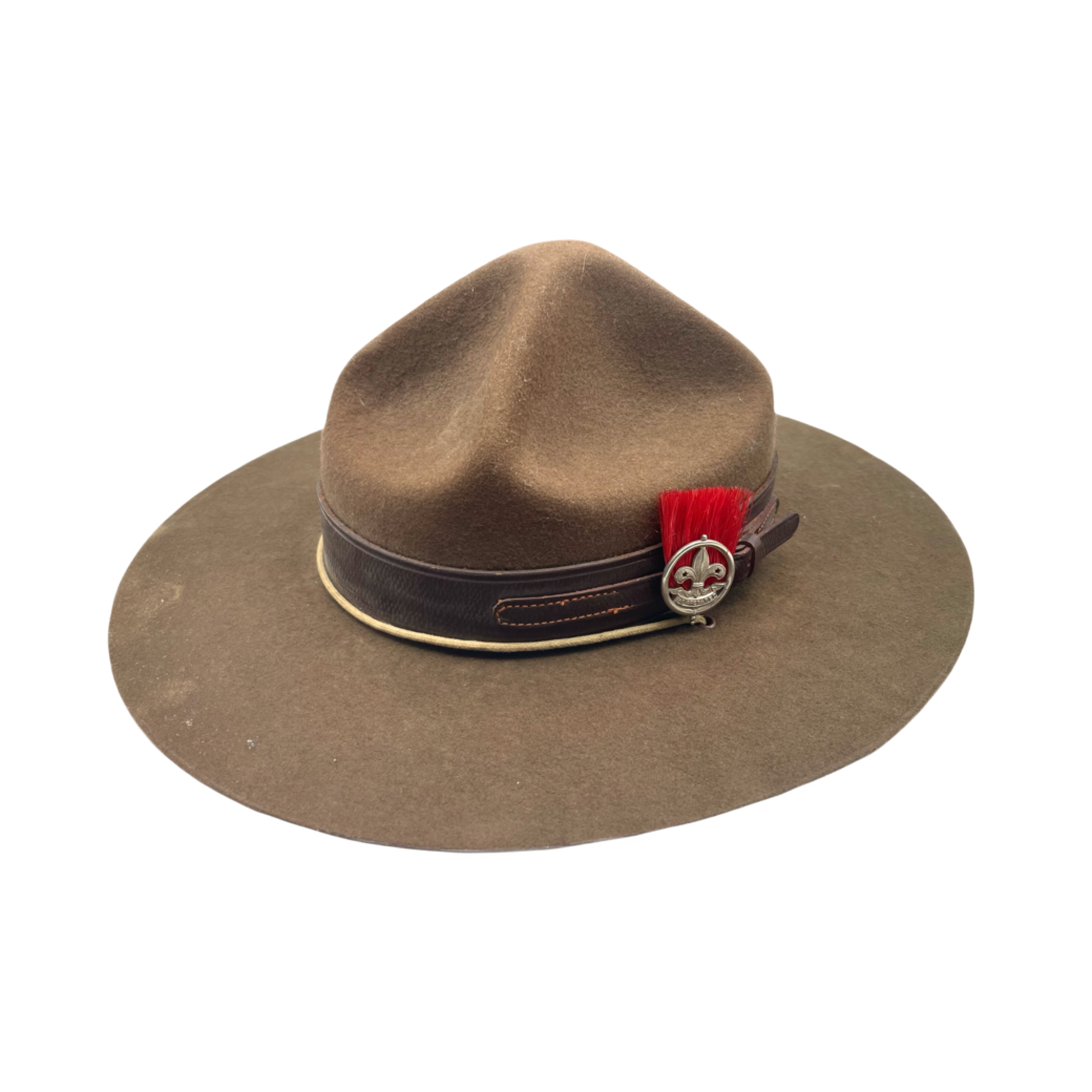 - Insignia: It is adorned with a metal fleur-de-lis badge, the universal symbol of the Scouting movement. A red bristle plume is attached, which in some Commonwealth scouting associations indicated the rank of an Assistant Scoutmaster.