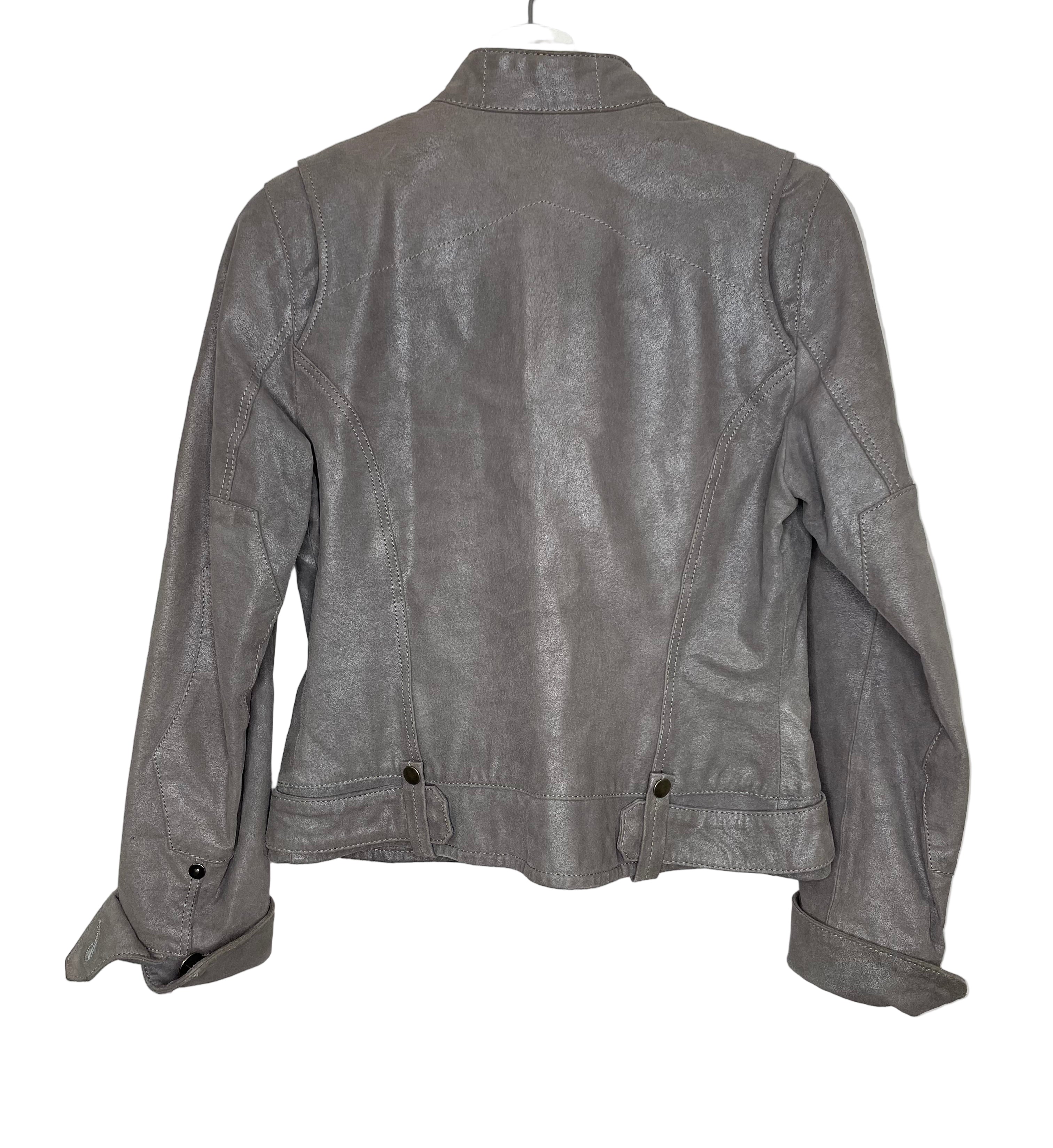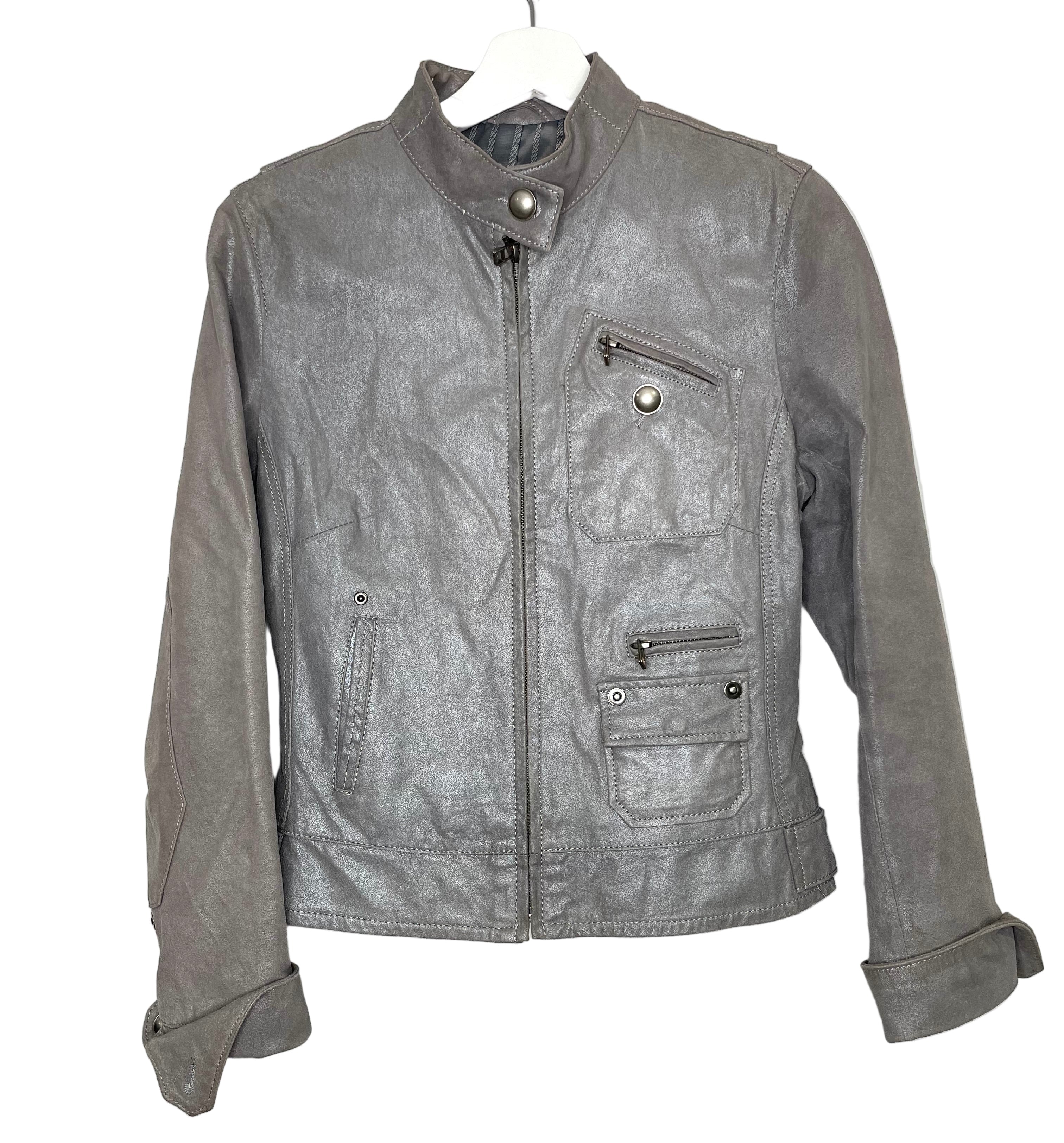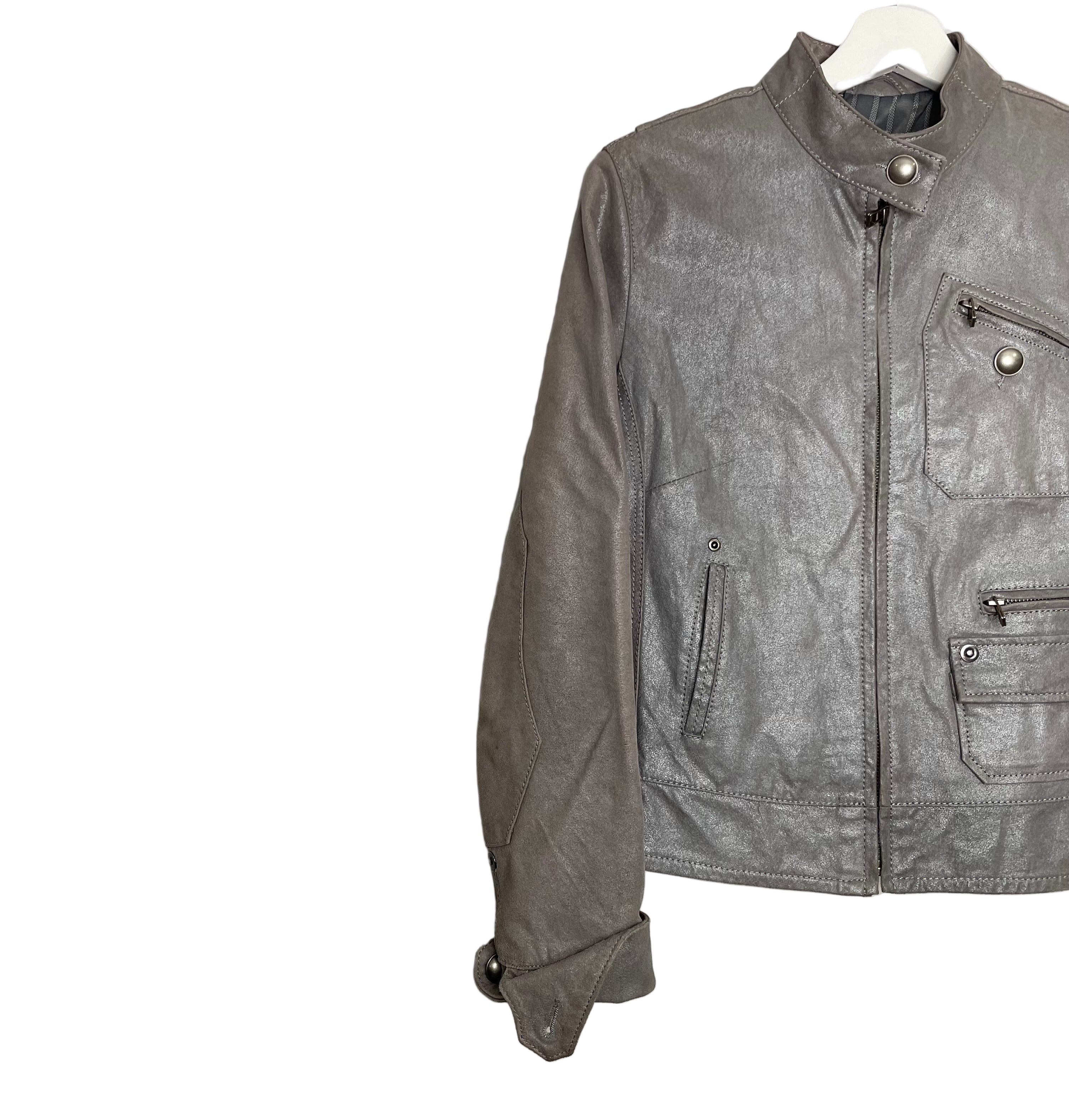• Style: Single rider moto-inspired jacket. Features a snap-button collar for a structured neckline. Full front zipper closure for classic moto styling. Multiple functional front pockets, including zippered chest and lower pockets. Sleeves finished with cuffed ends for a clean, tailored appearance.