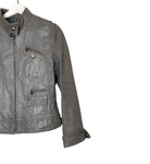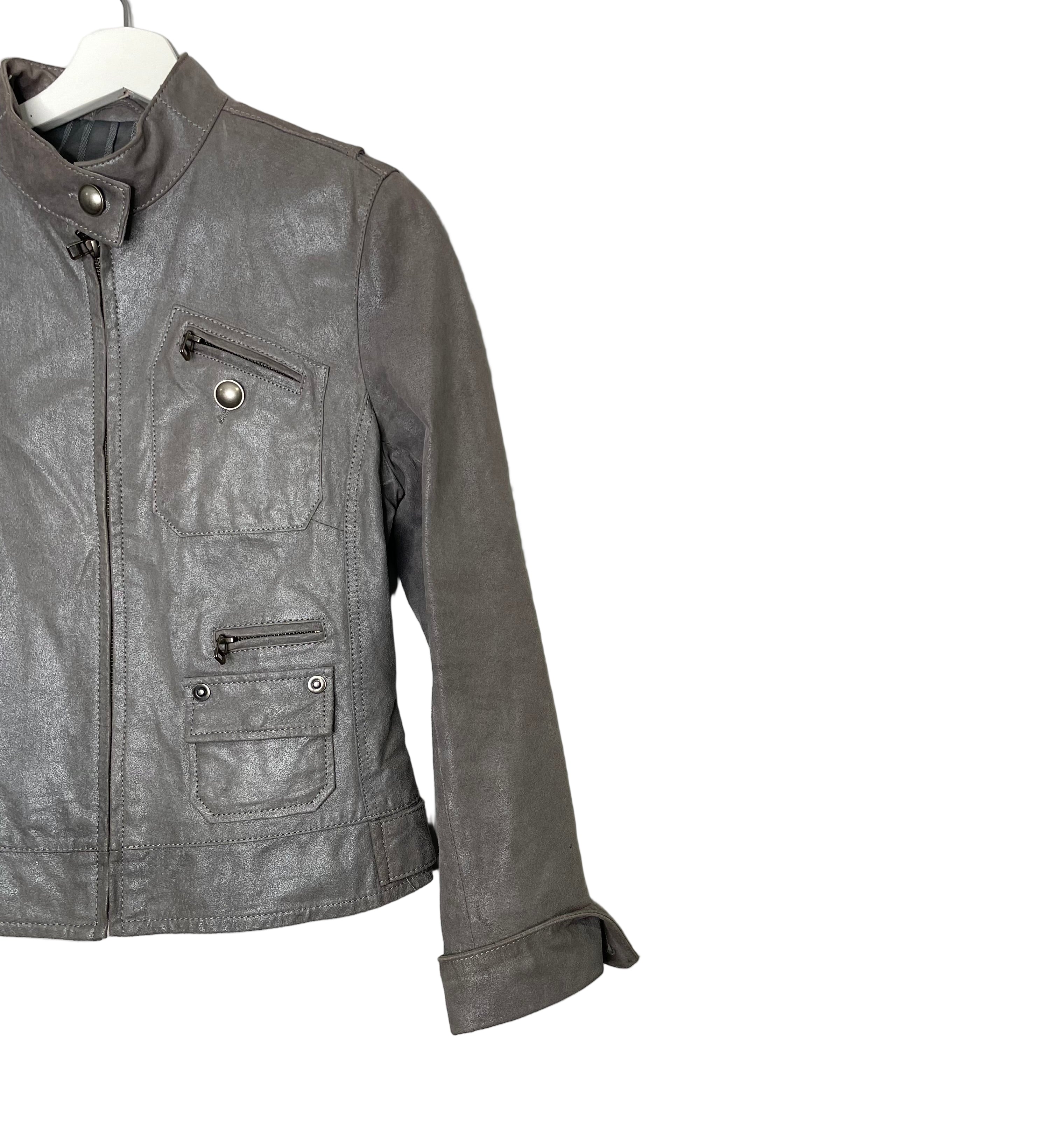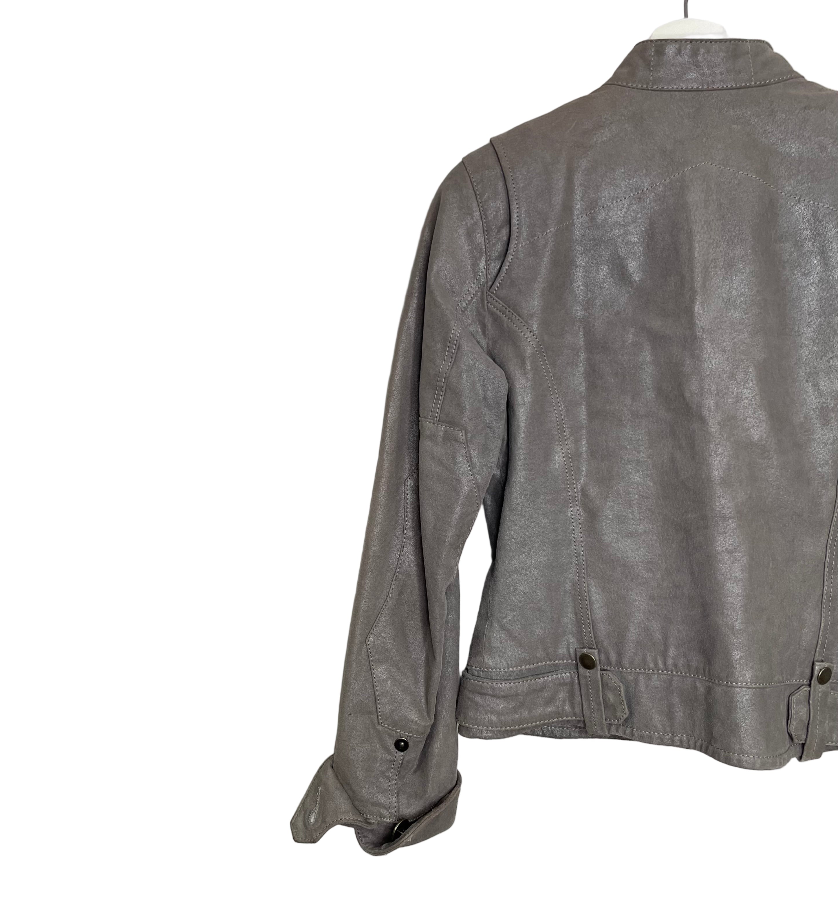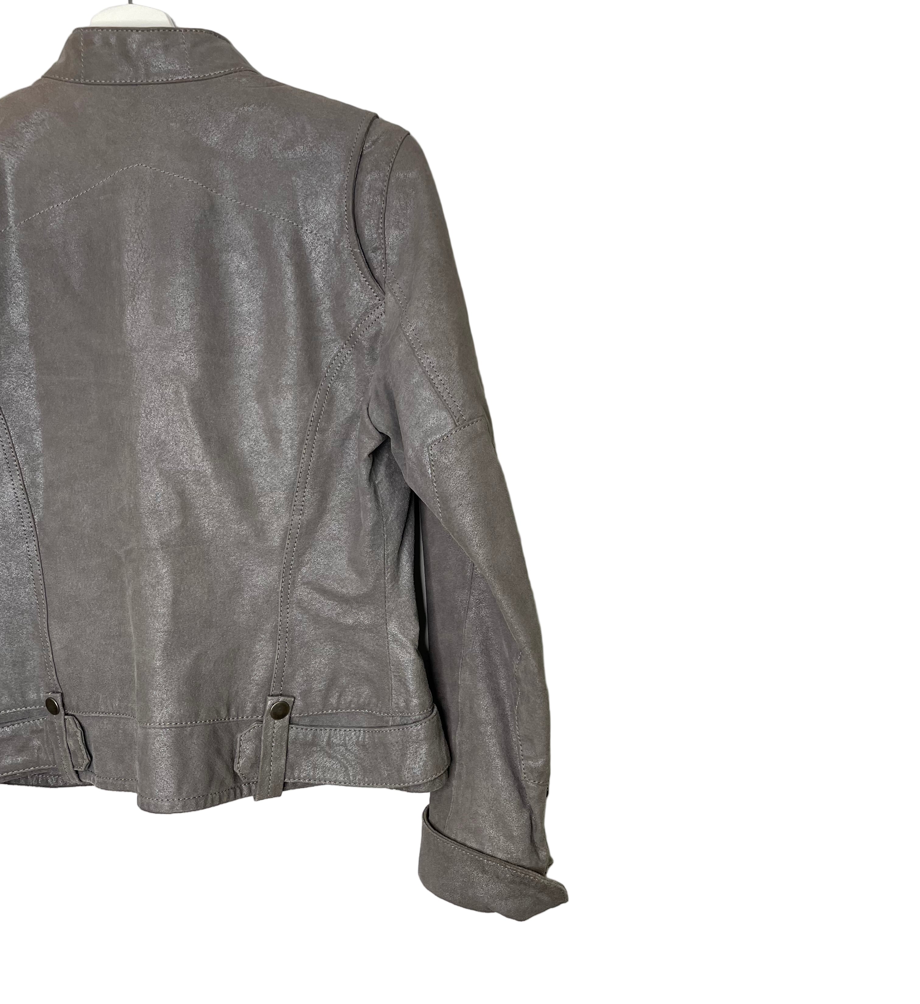 • Style: Single rider moto-inspired jacket. Features a snap-button collar for a structured neckline. Full front zipper closure for classic moto styling. Multiple functional front pockets, including zippered chest and lower pockets. Sleeves finished with cuffed ends for a clean, tailored appearance.