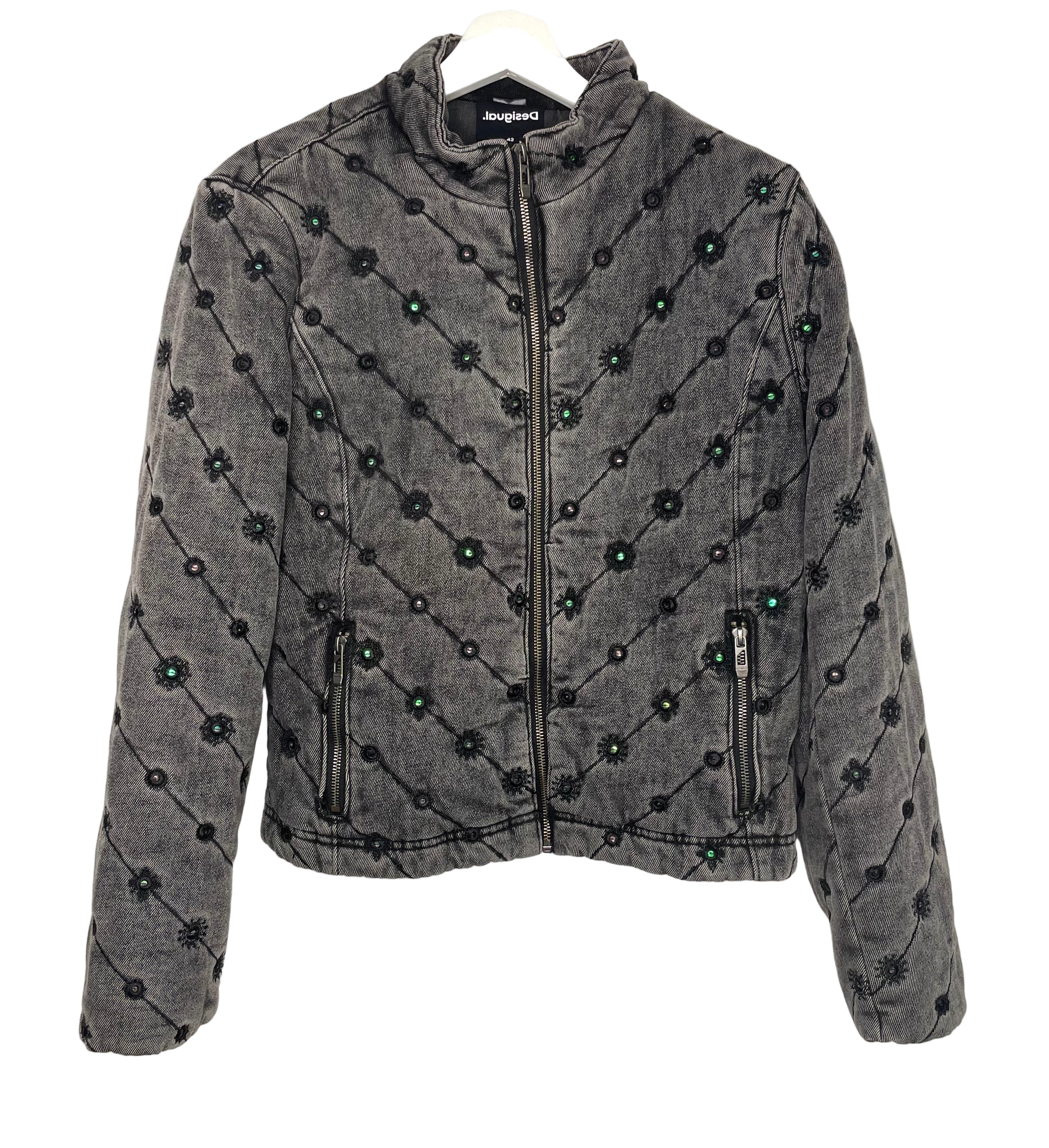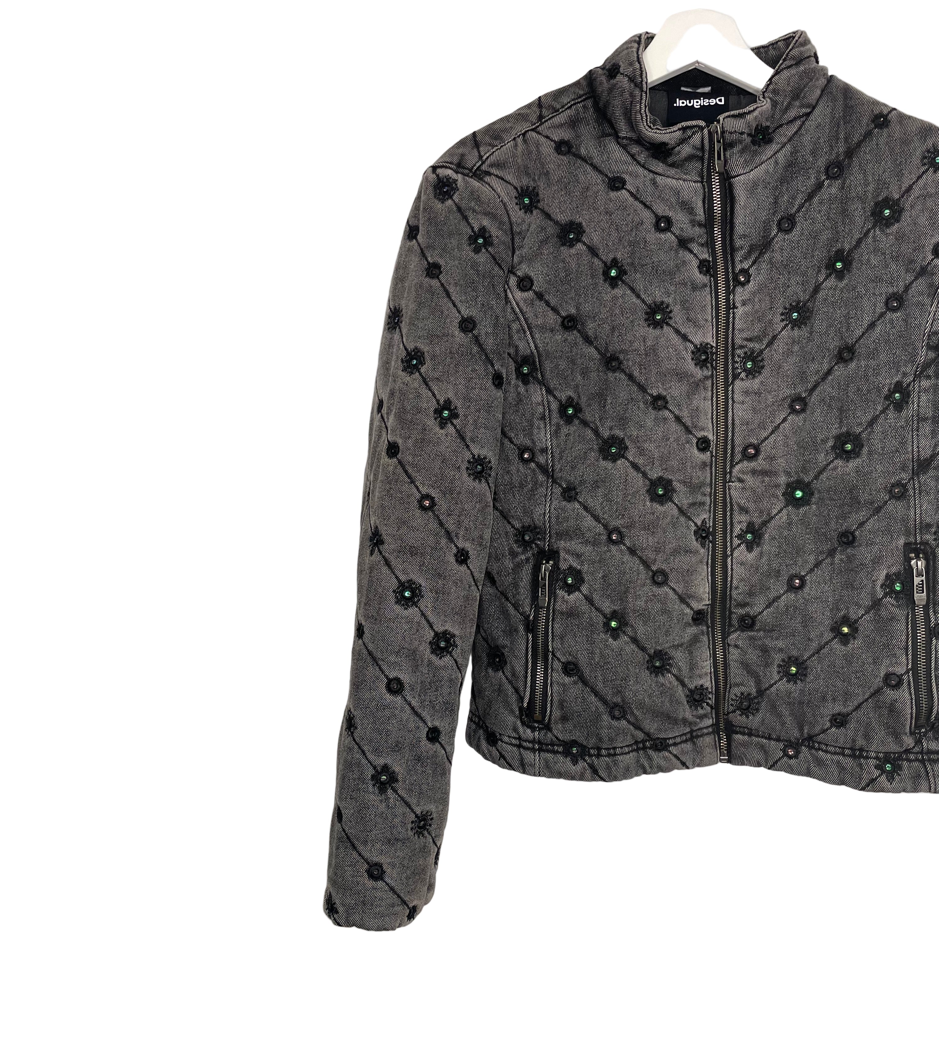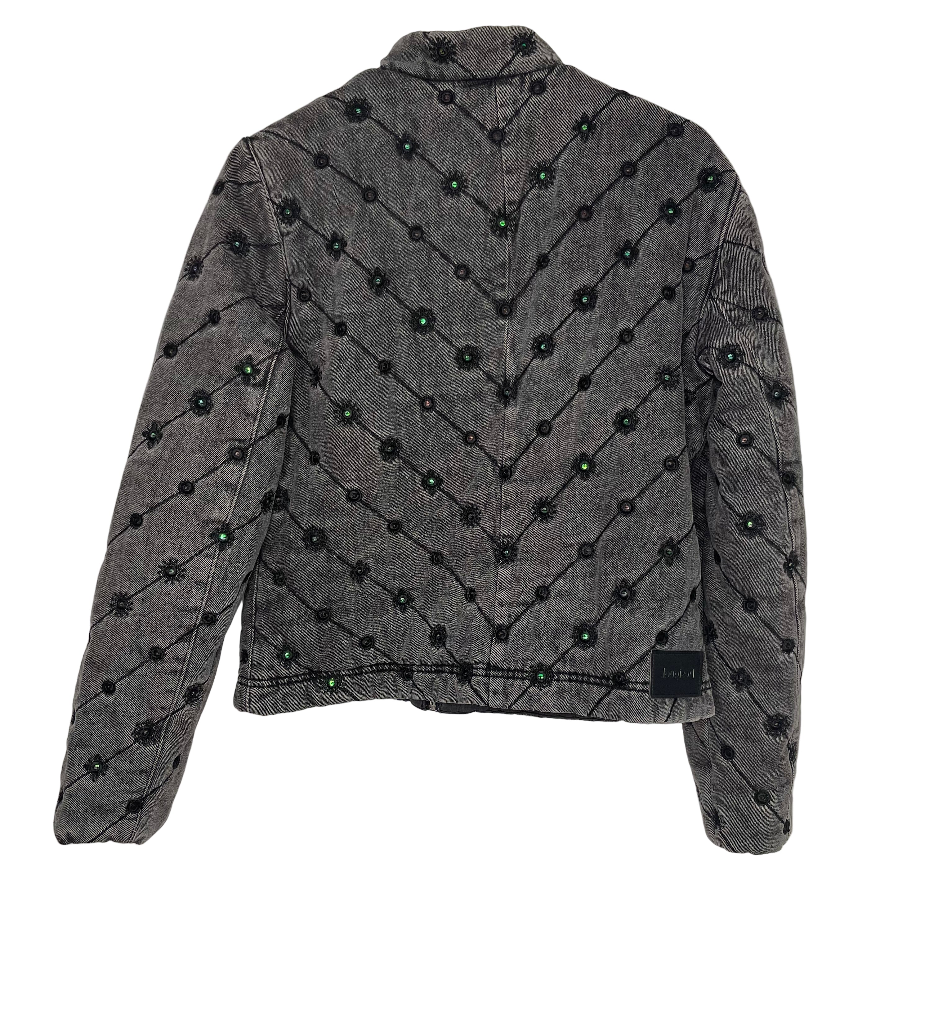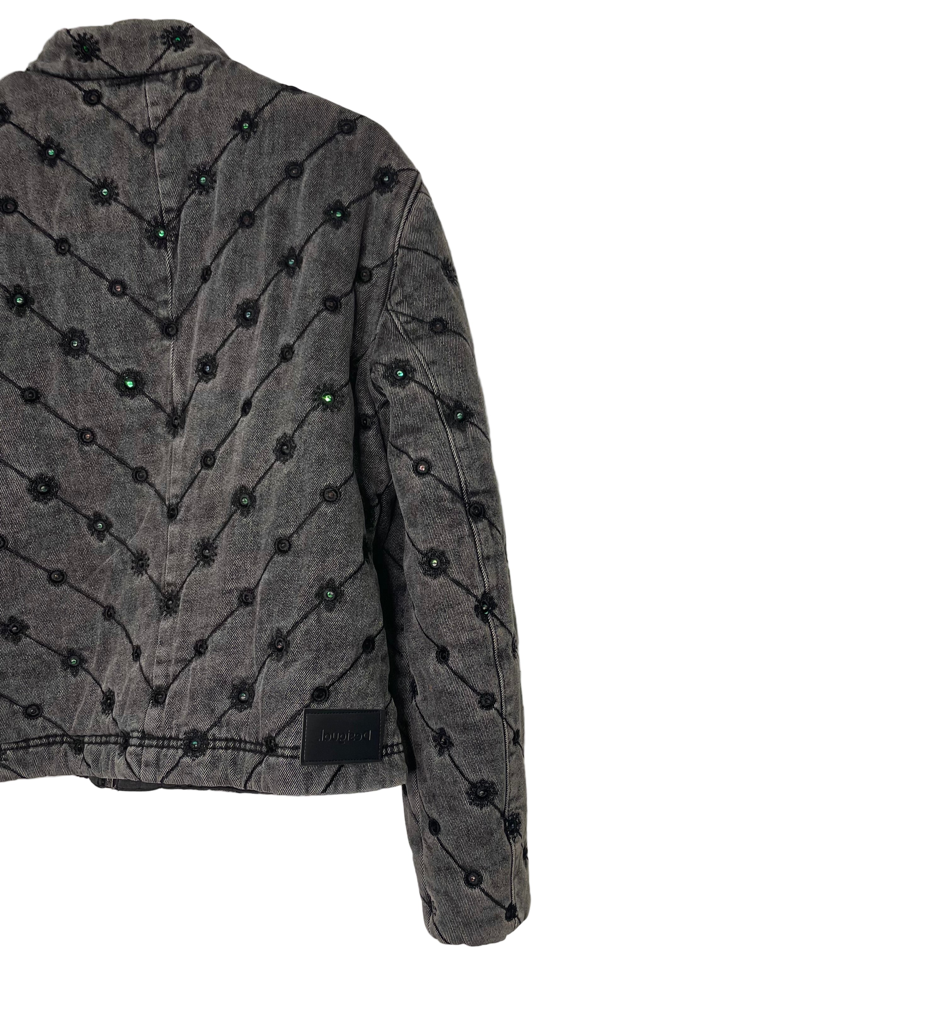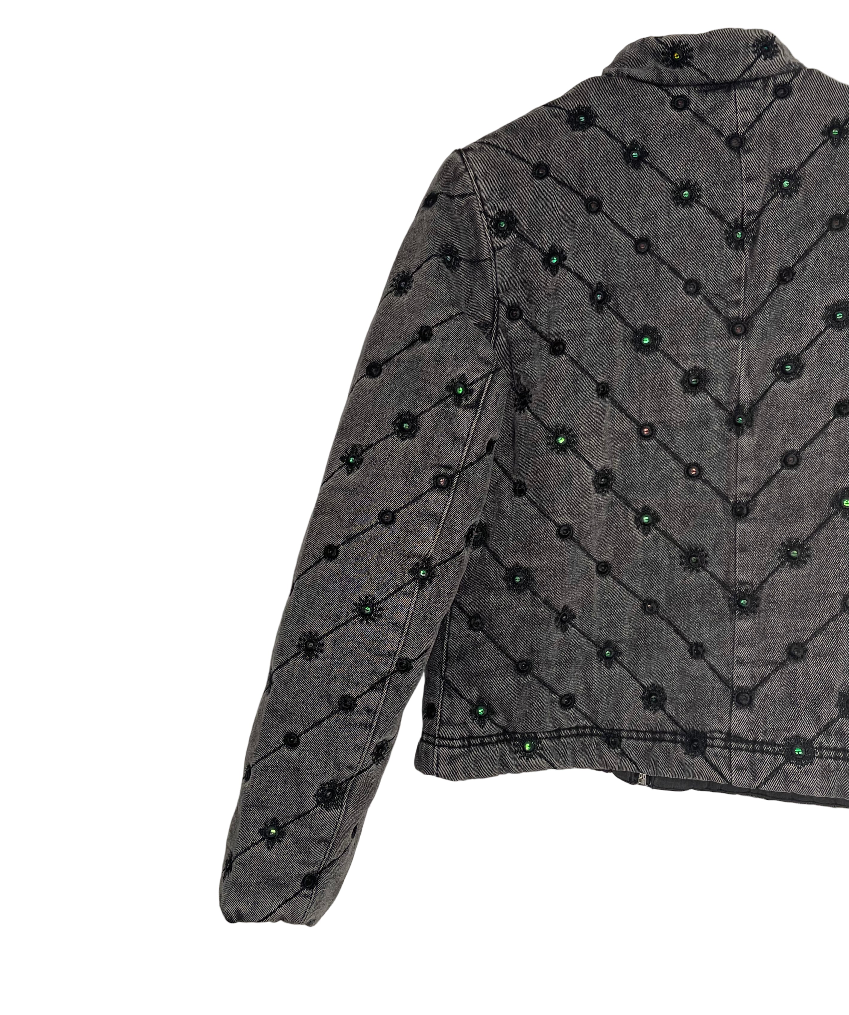 • Design: Quilted effect with black embroidery and small green/multicolor sequin details in a floral/mandala pattern
