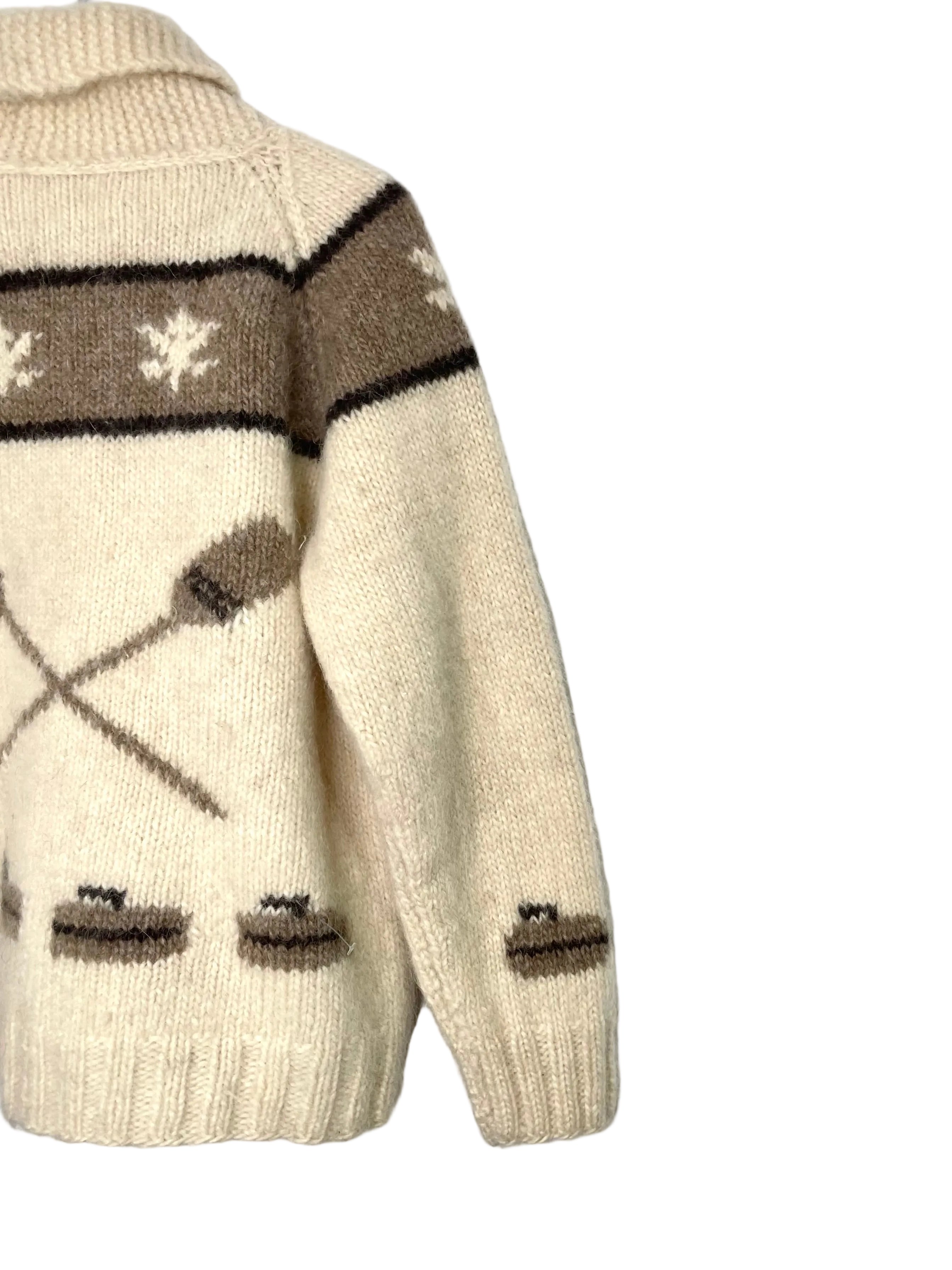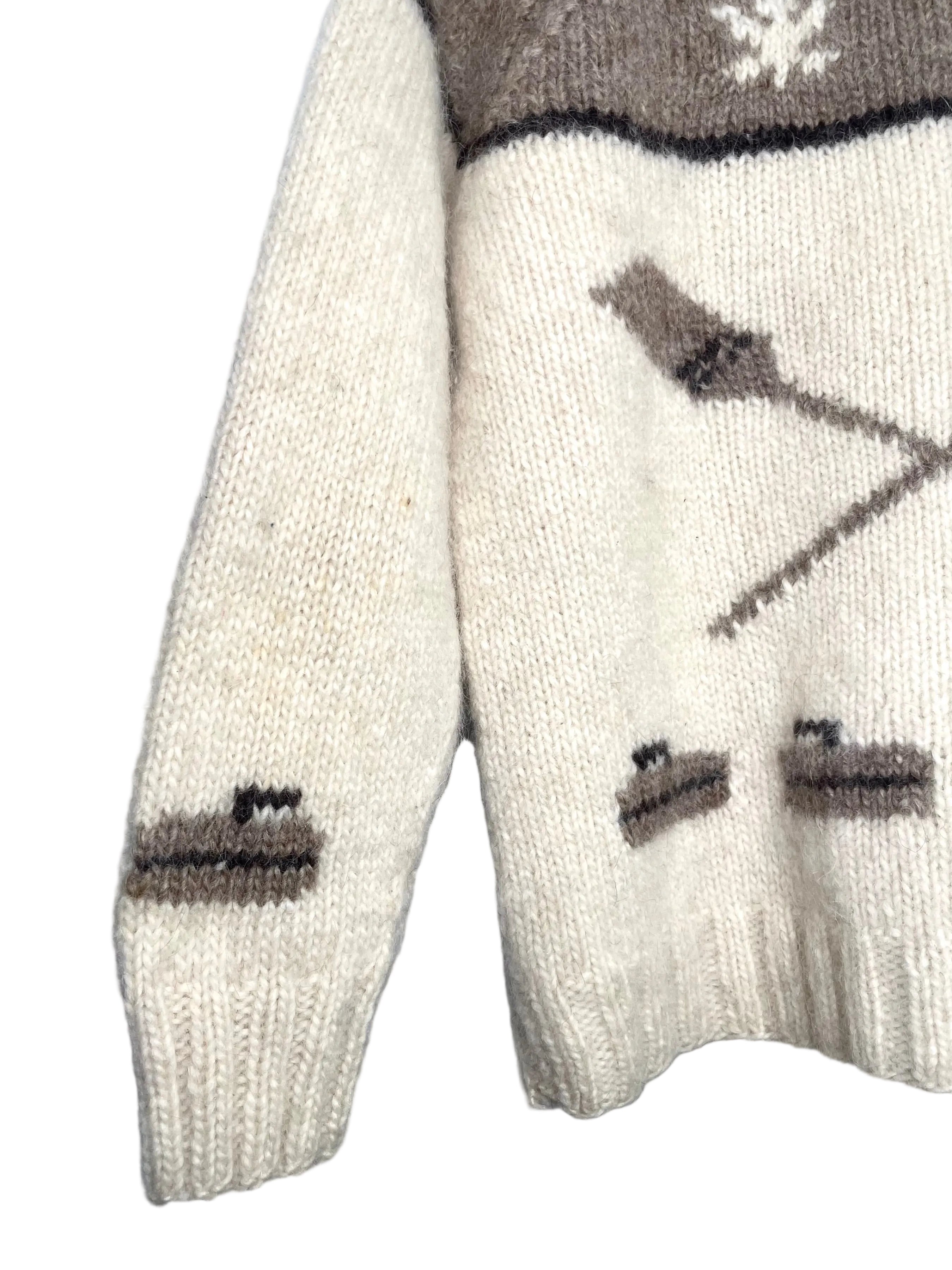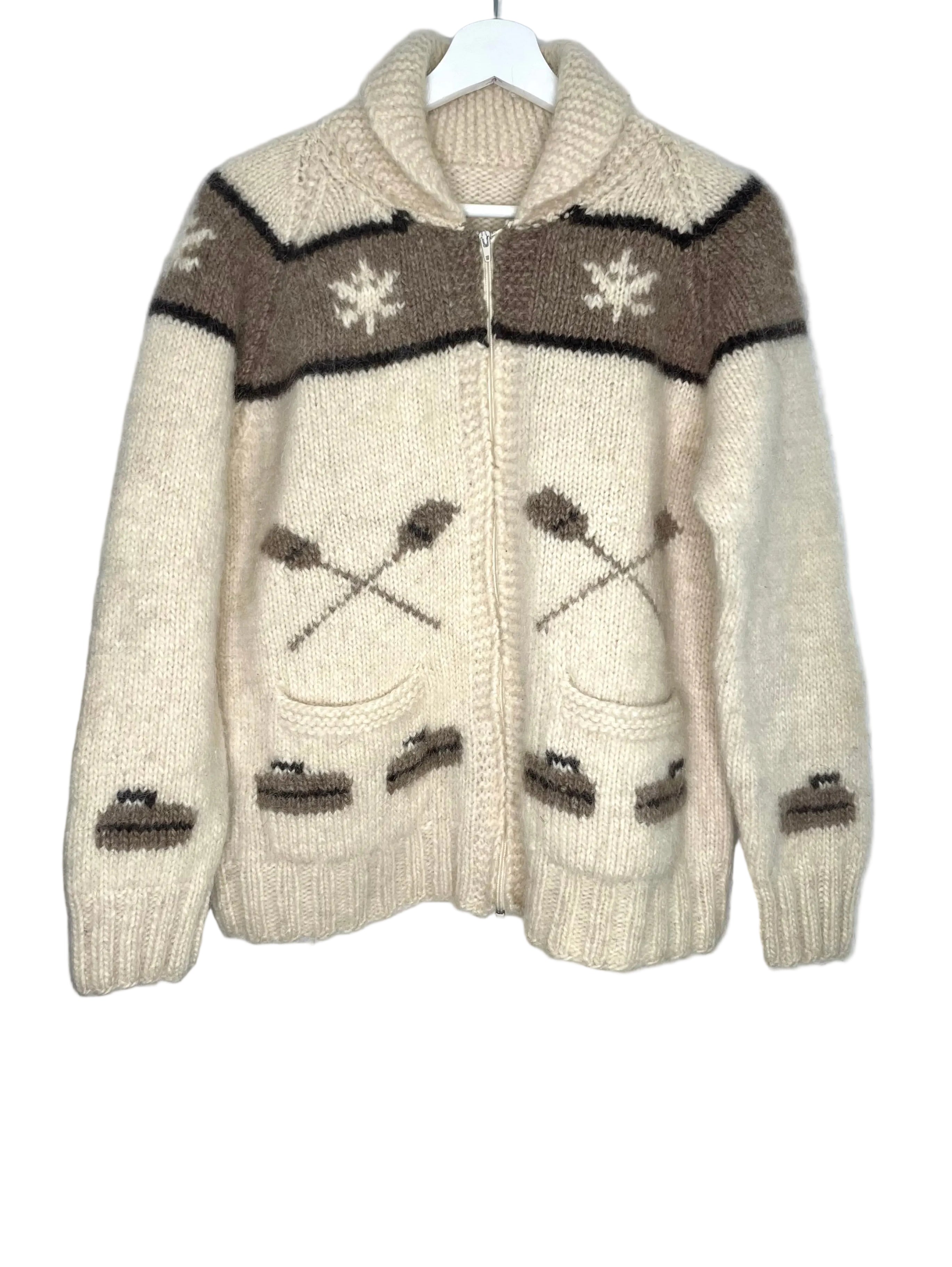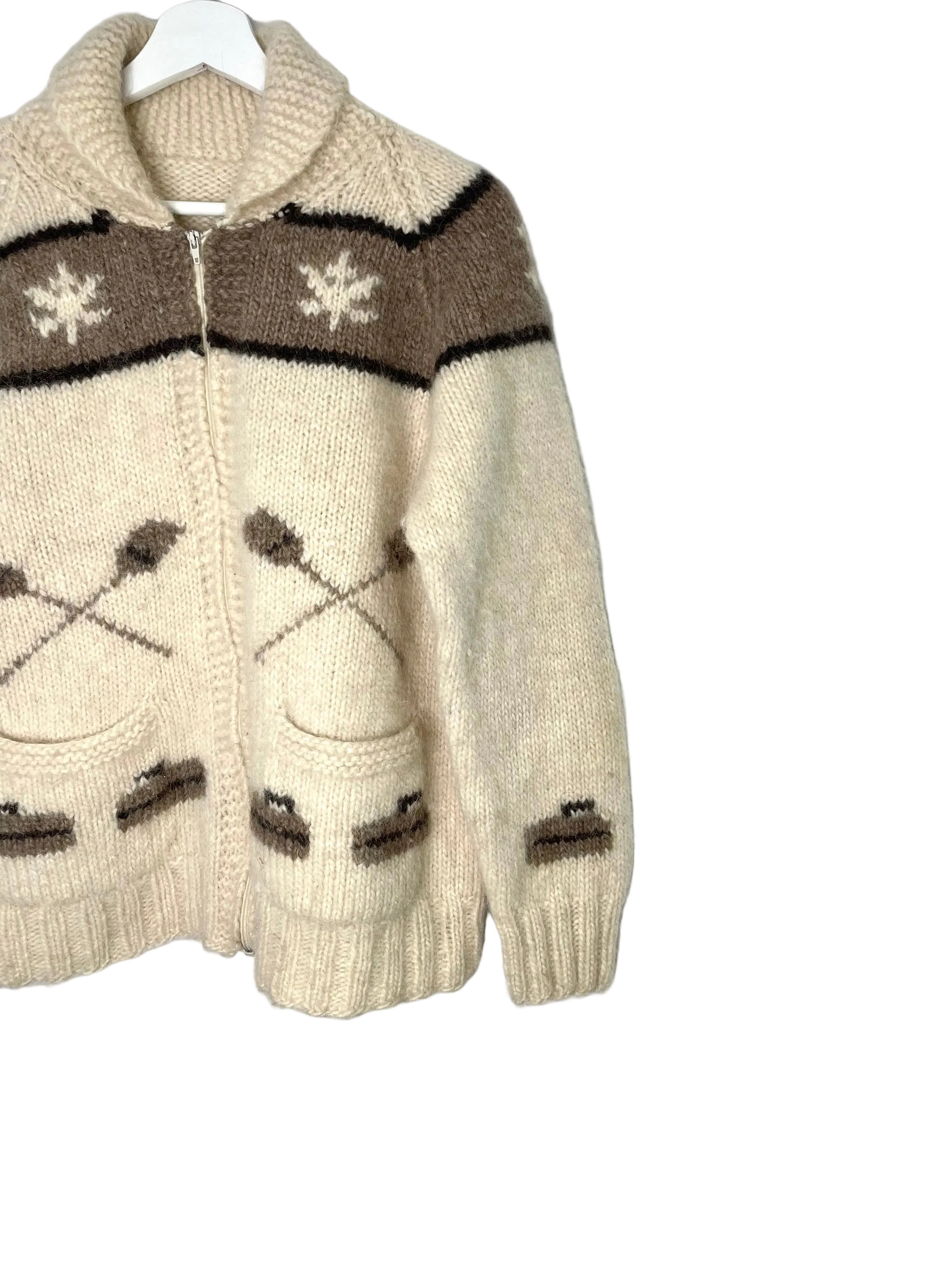 - Design: The sweater features a shawl collar, a full-length zipper, and two front pockets, consistent with classic Cowichan designs.