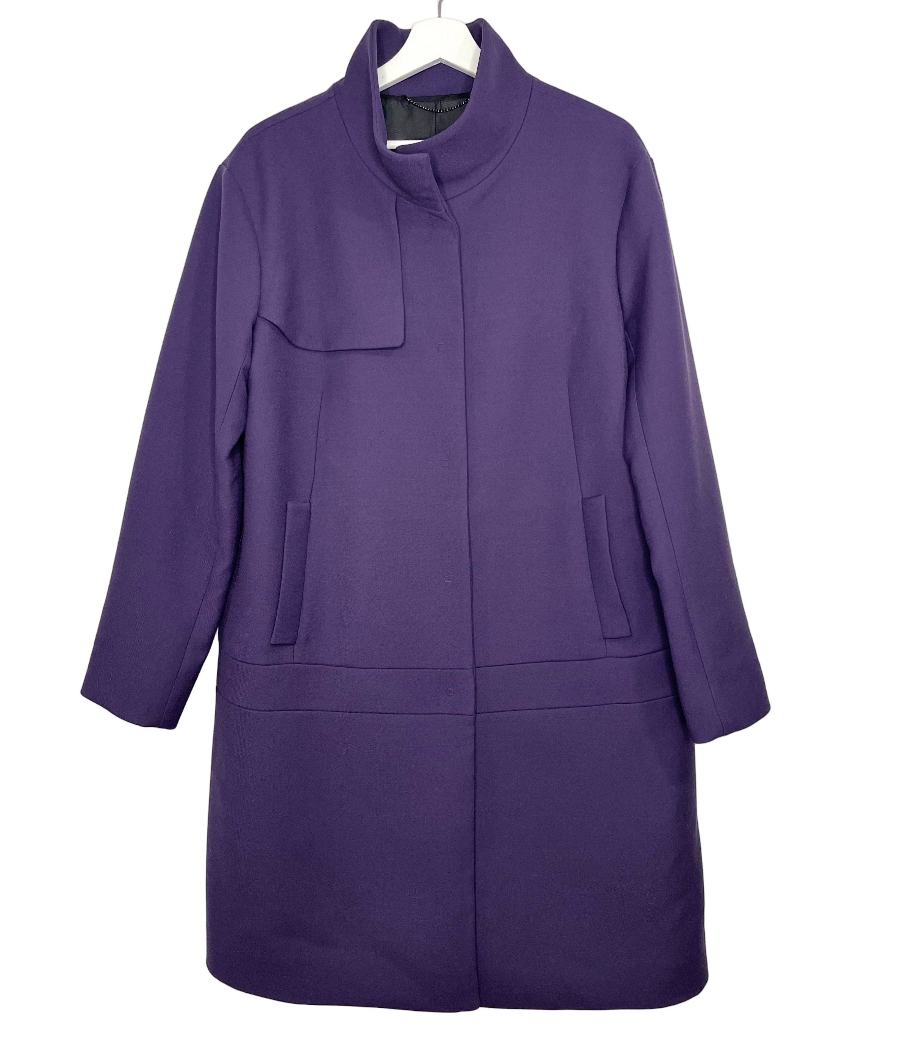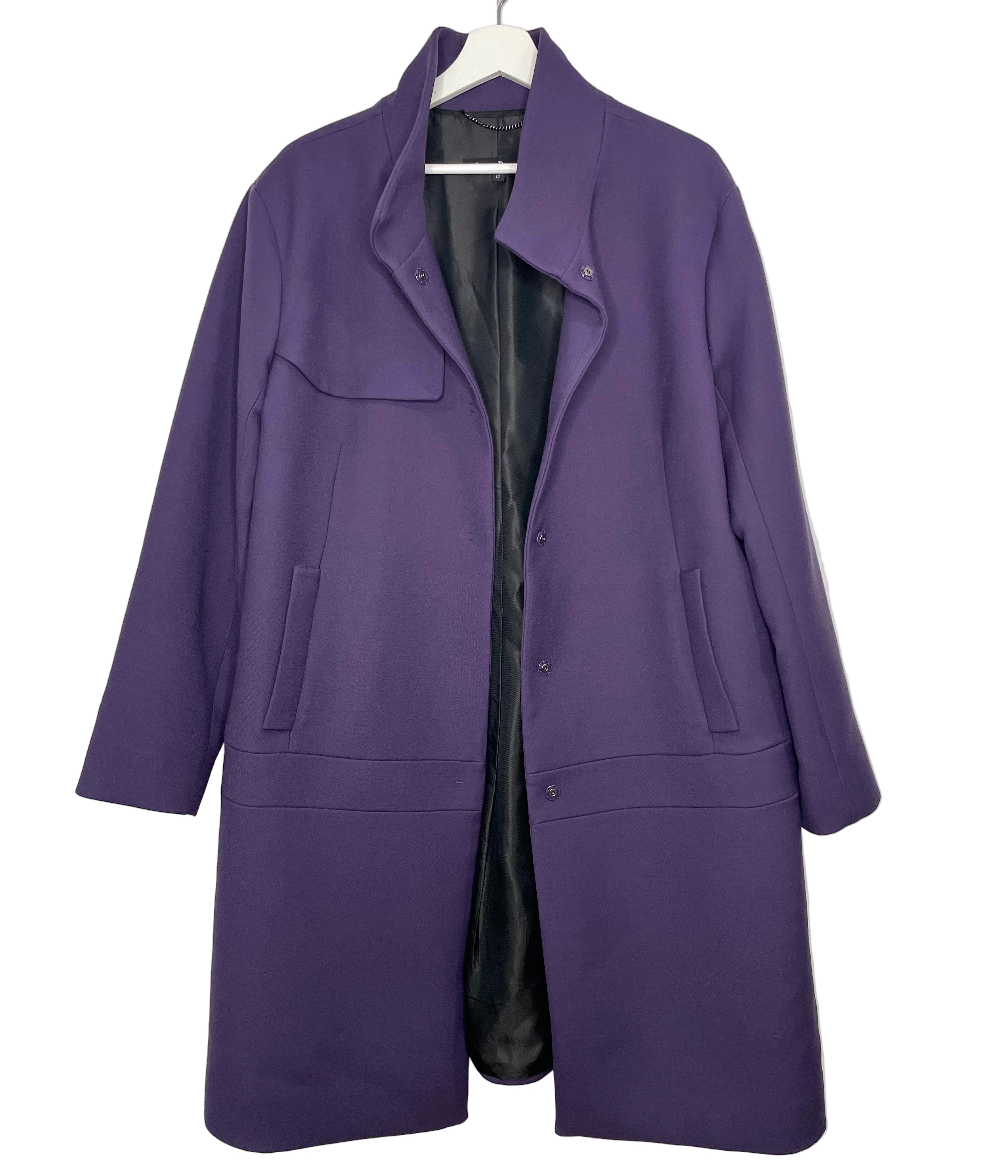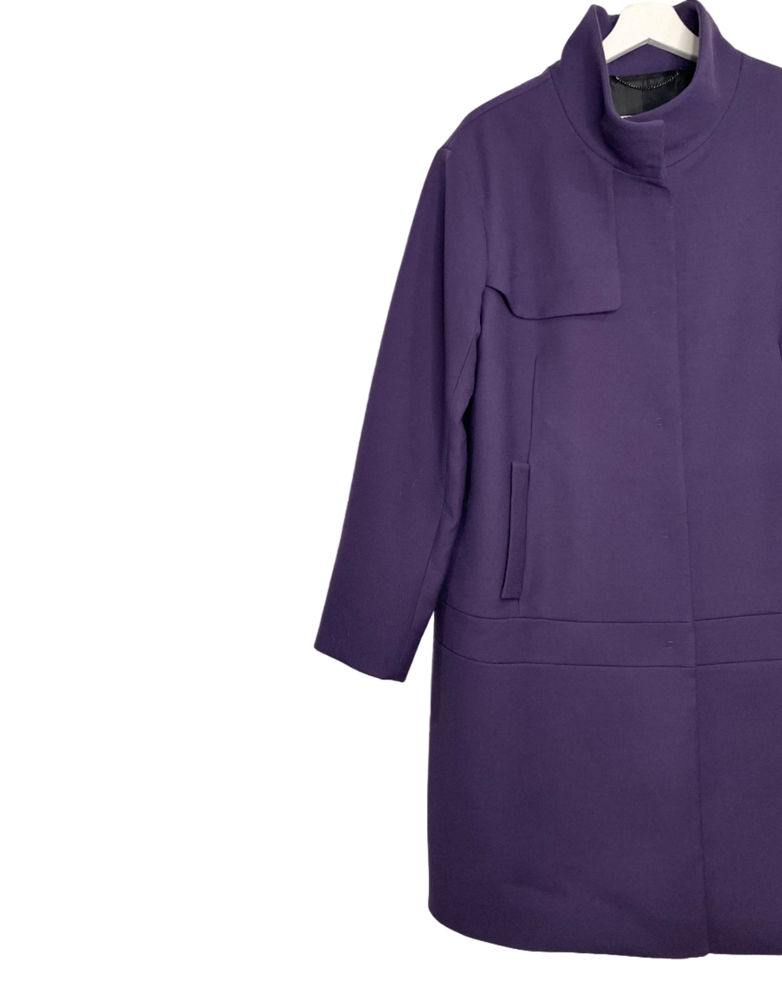 - Design: The coat features clean lines with a minimalist, sculptural aesthetic. It has a stand collar and a hidden front closure, with buttons.