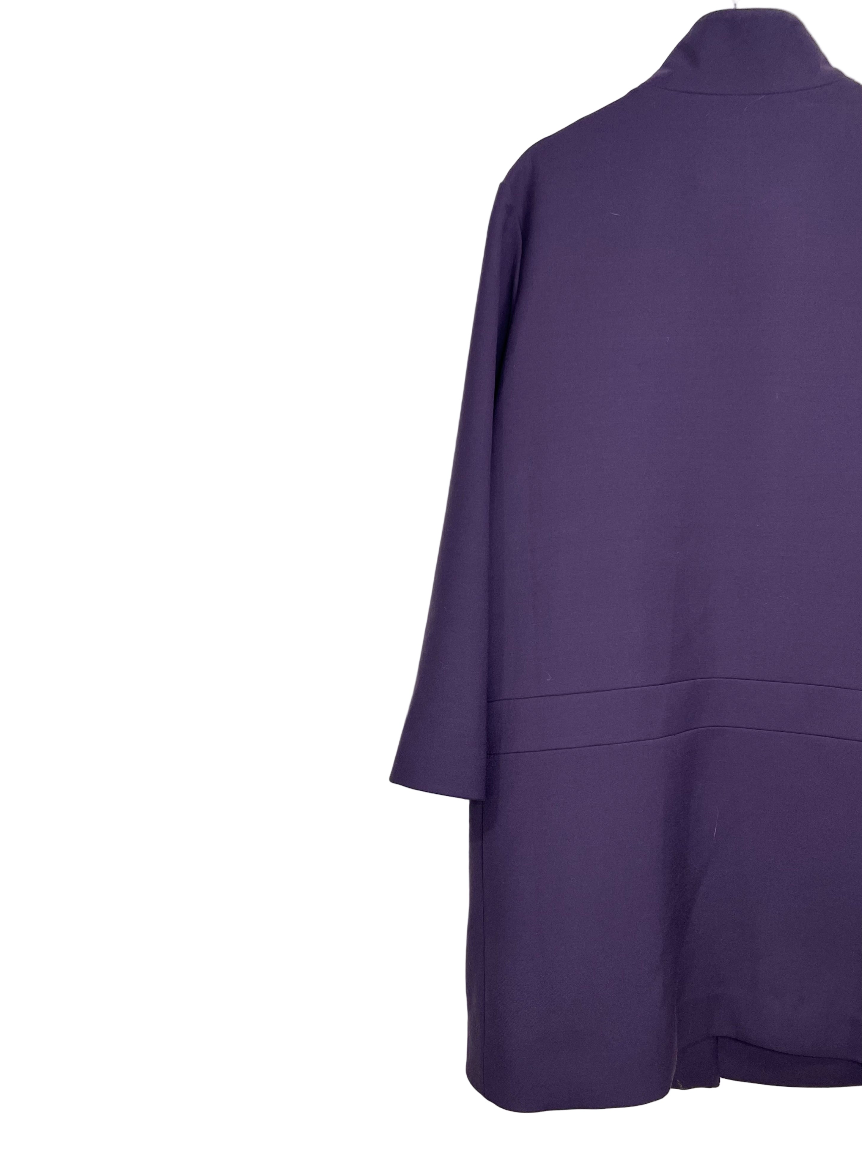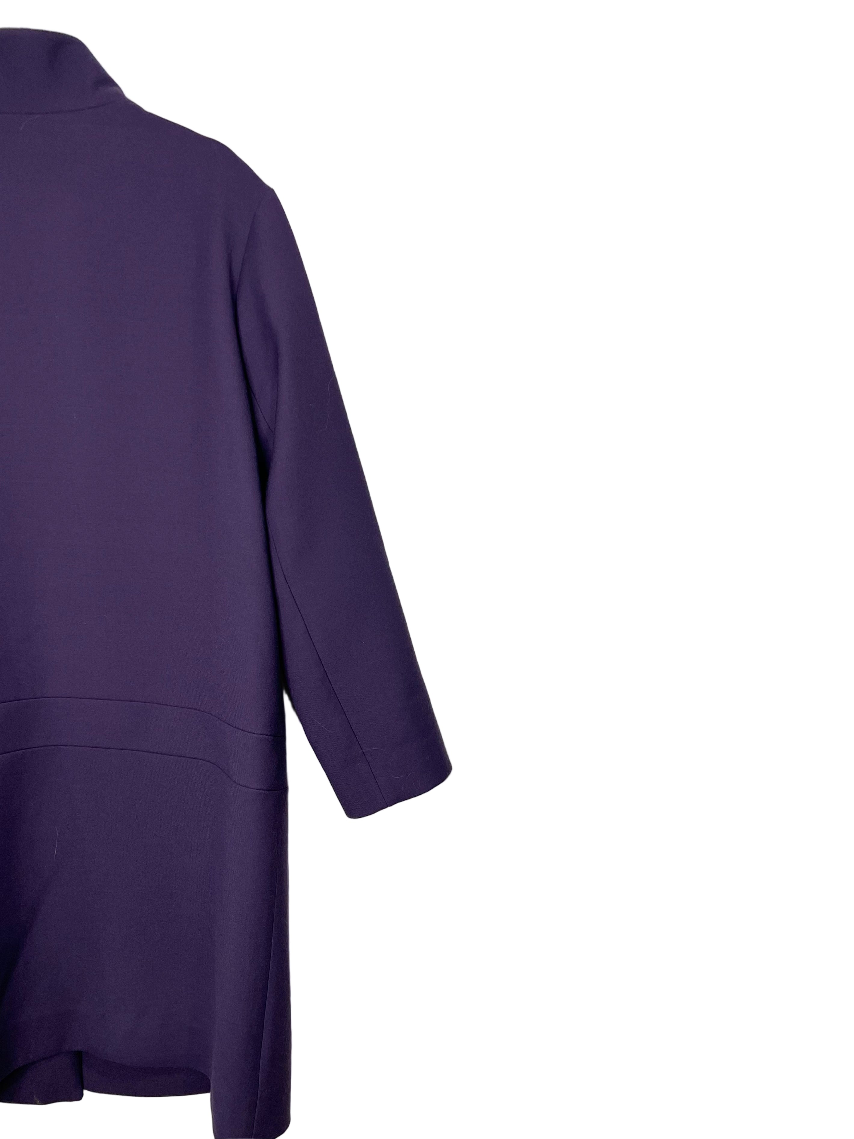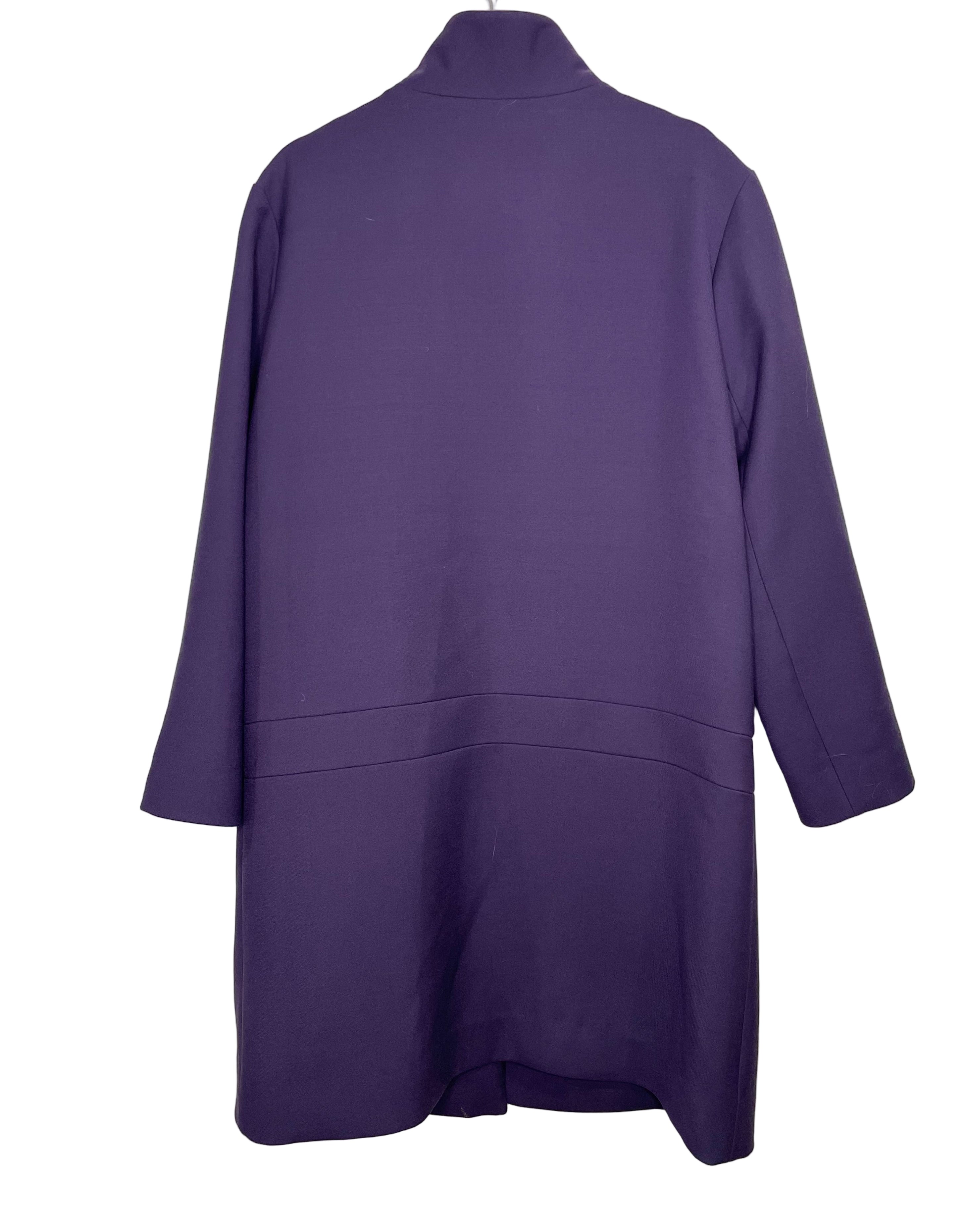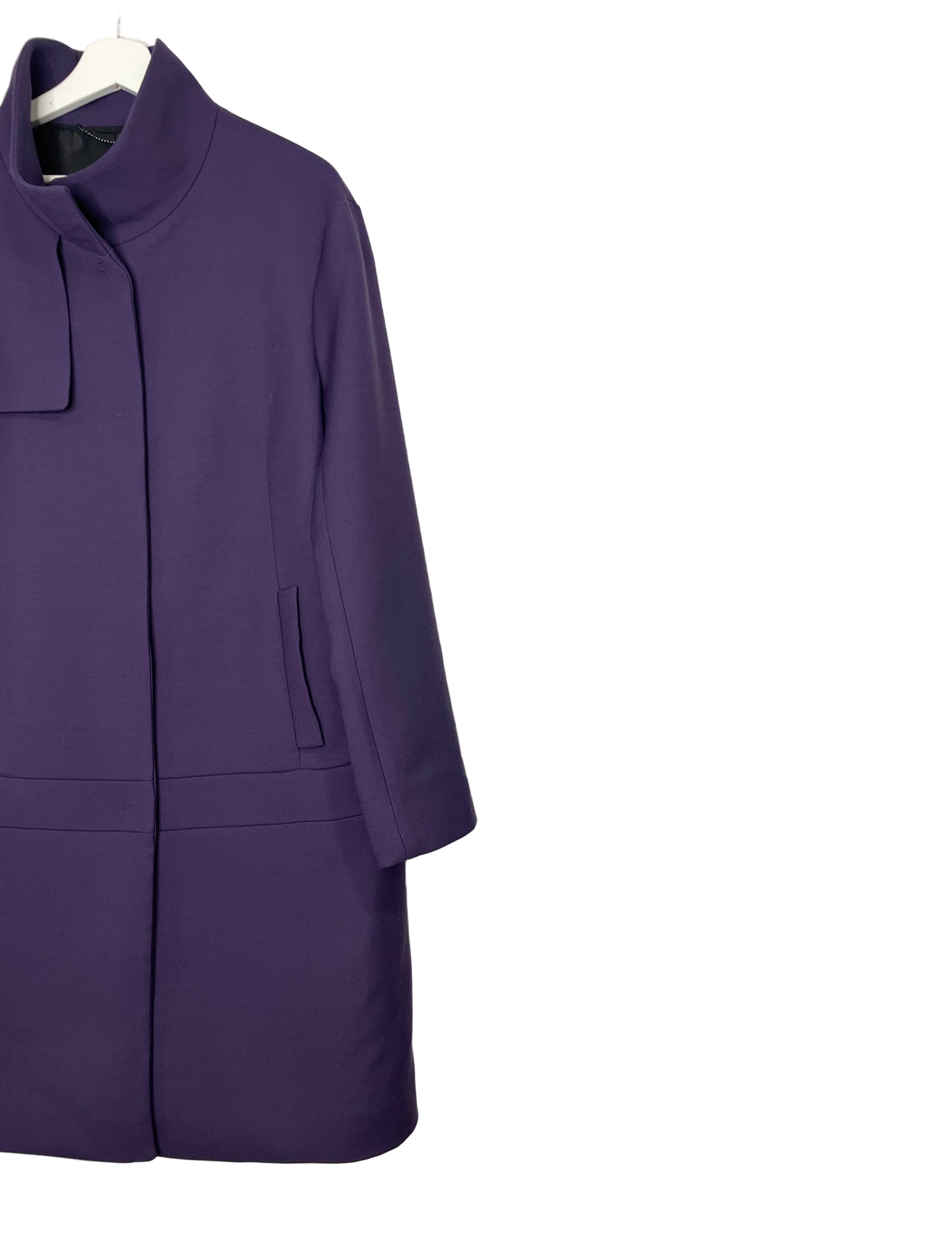 - Design: The coat features clean lines with a minimalist, sculptural aesthetic. It has a stand collar and a hidden front closure, with buttons.