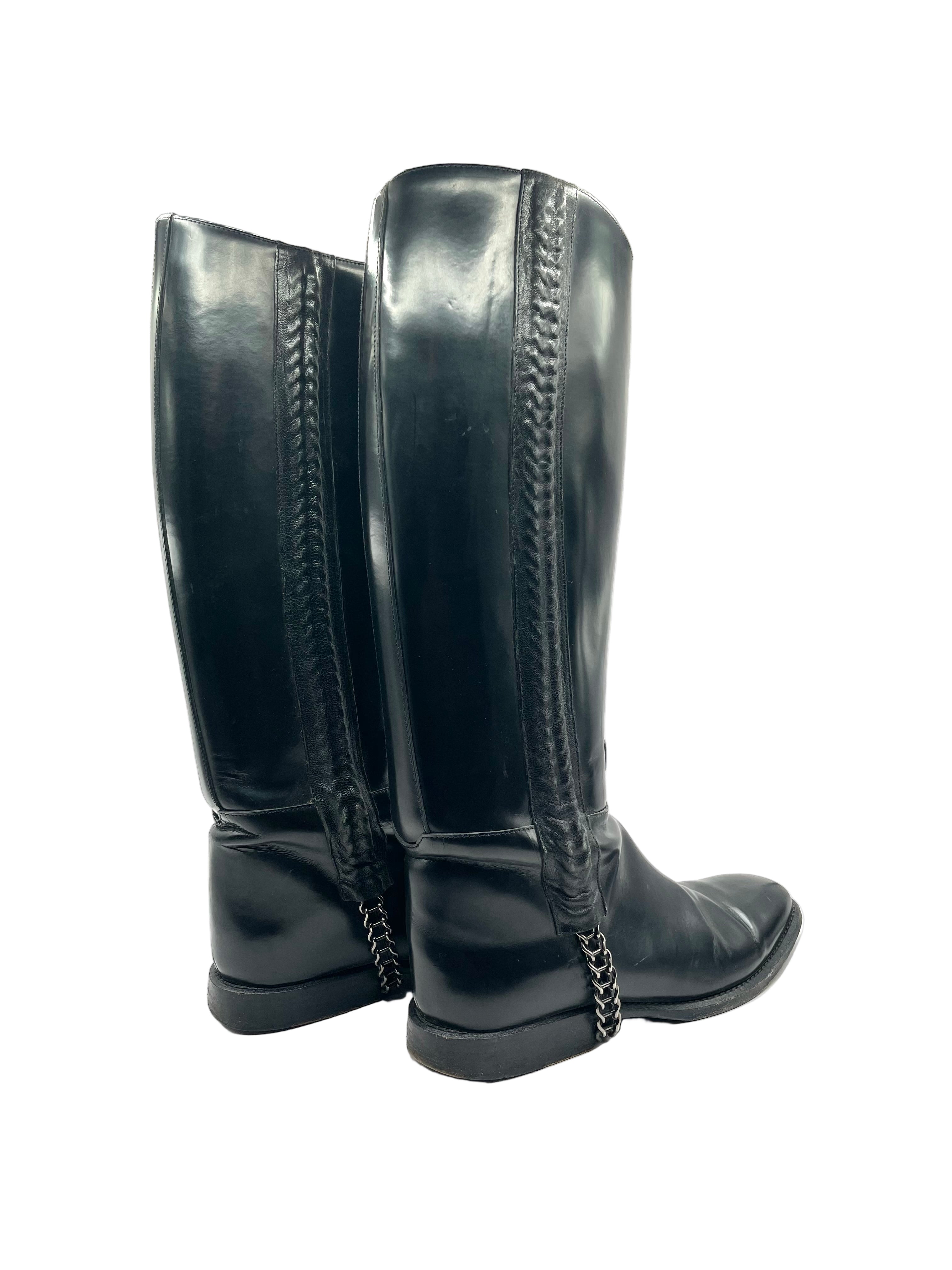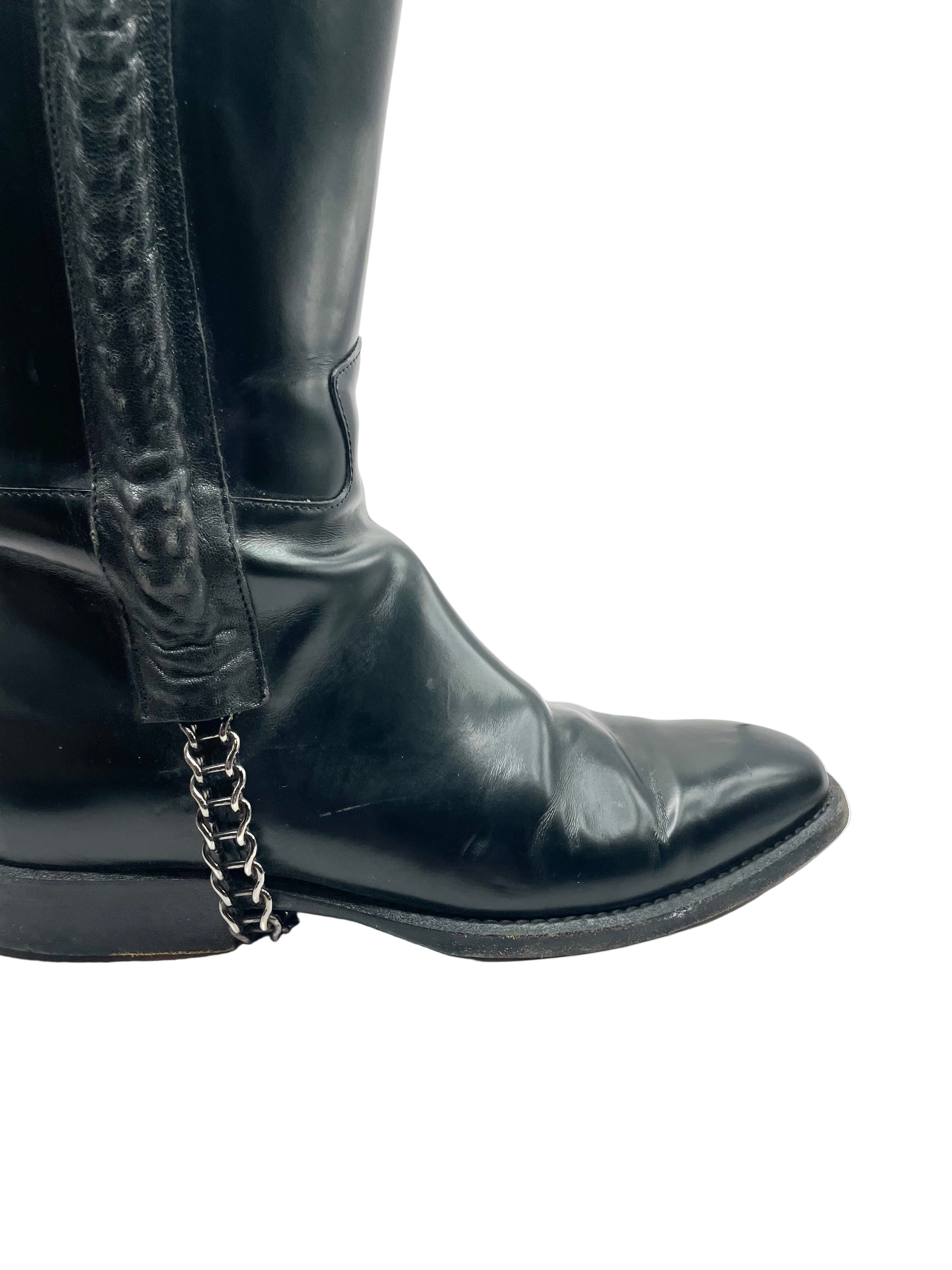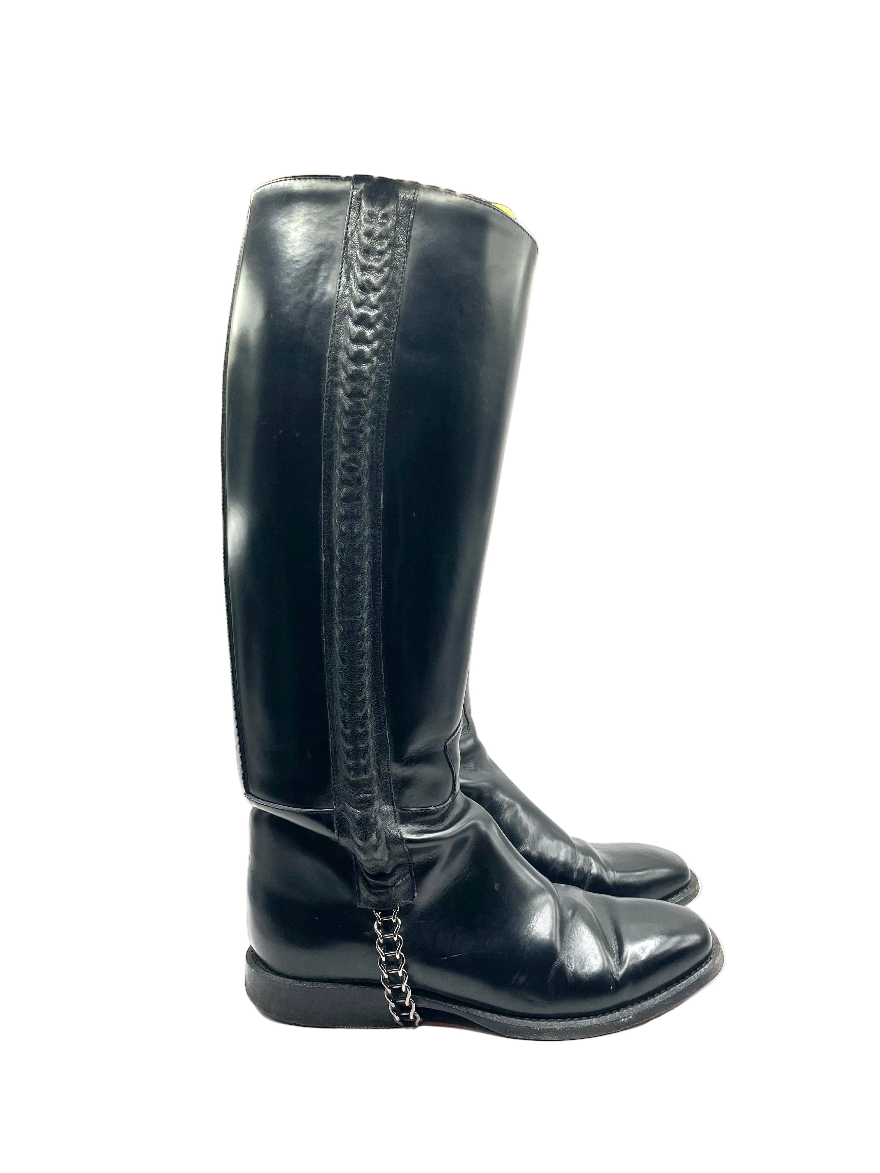 - Embellishments: The main feature is a prominent silver-tone chain-link accent that wraps around the ankle/vamp area of the boot. A subtle braided leather trim also runs vertically up the side of the shaft.