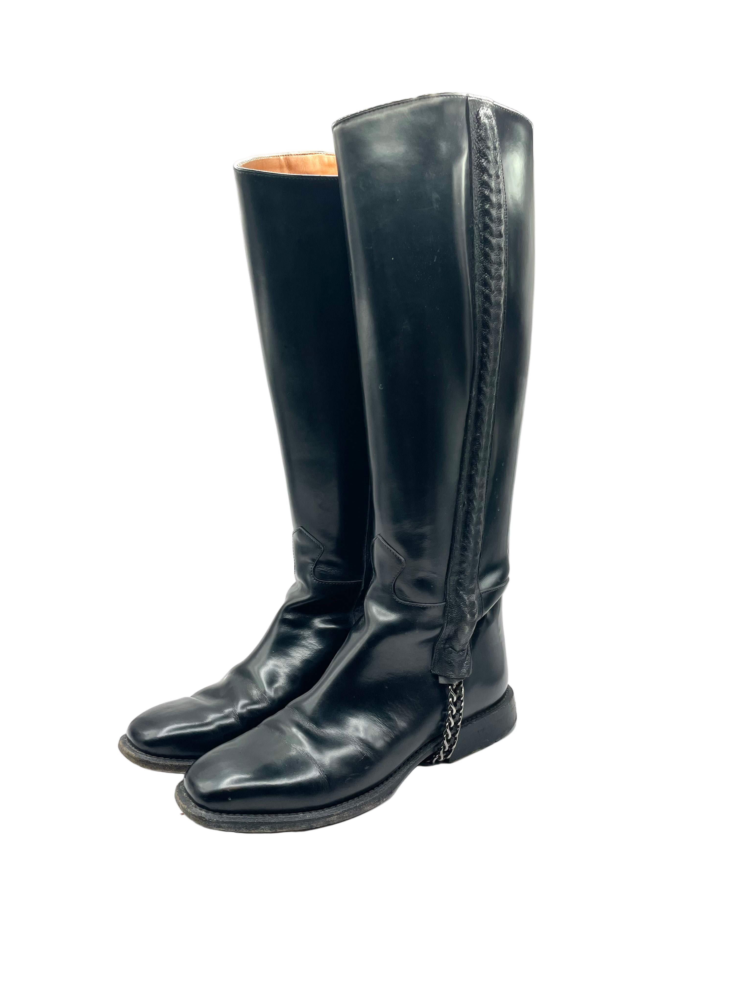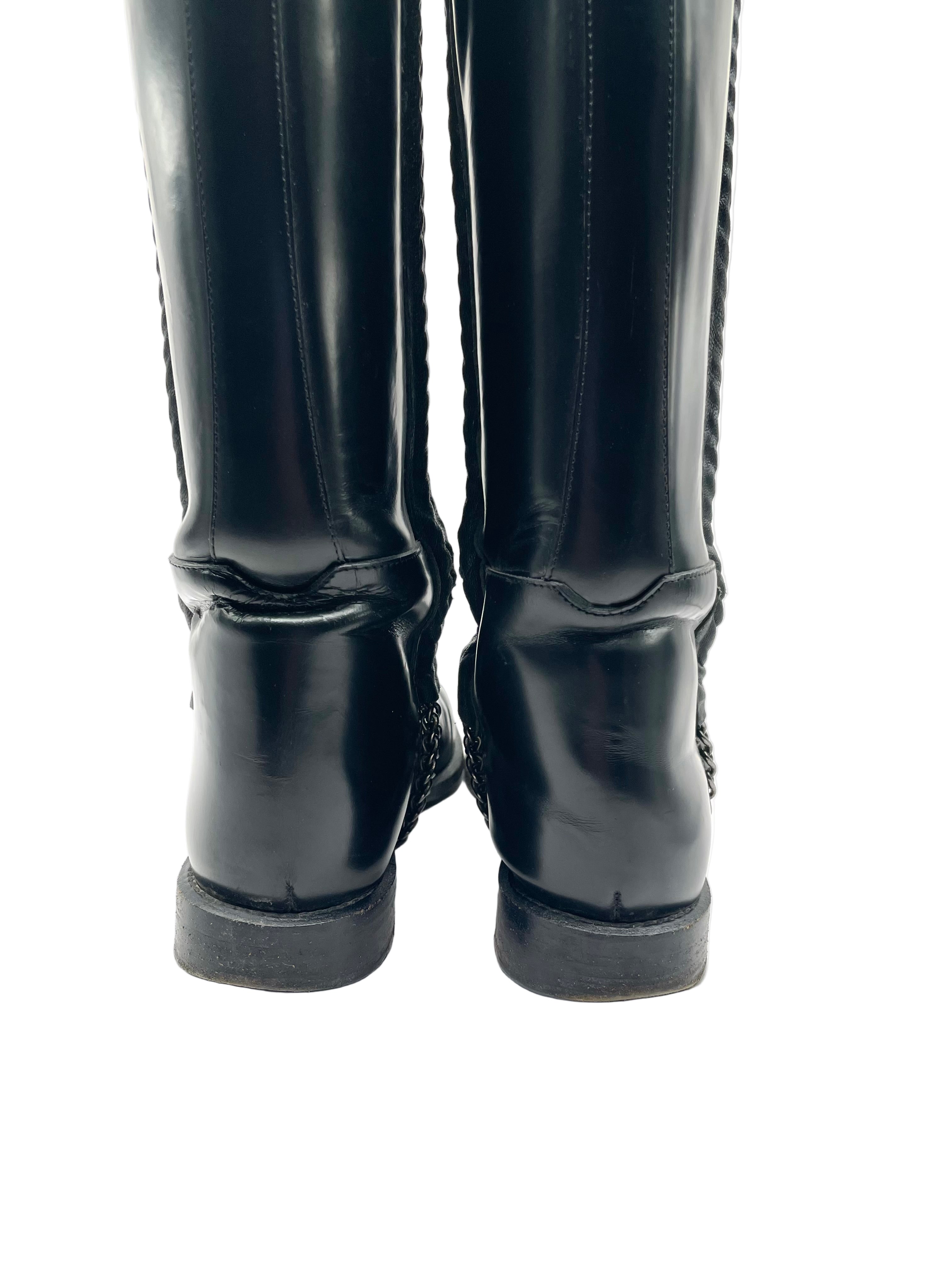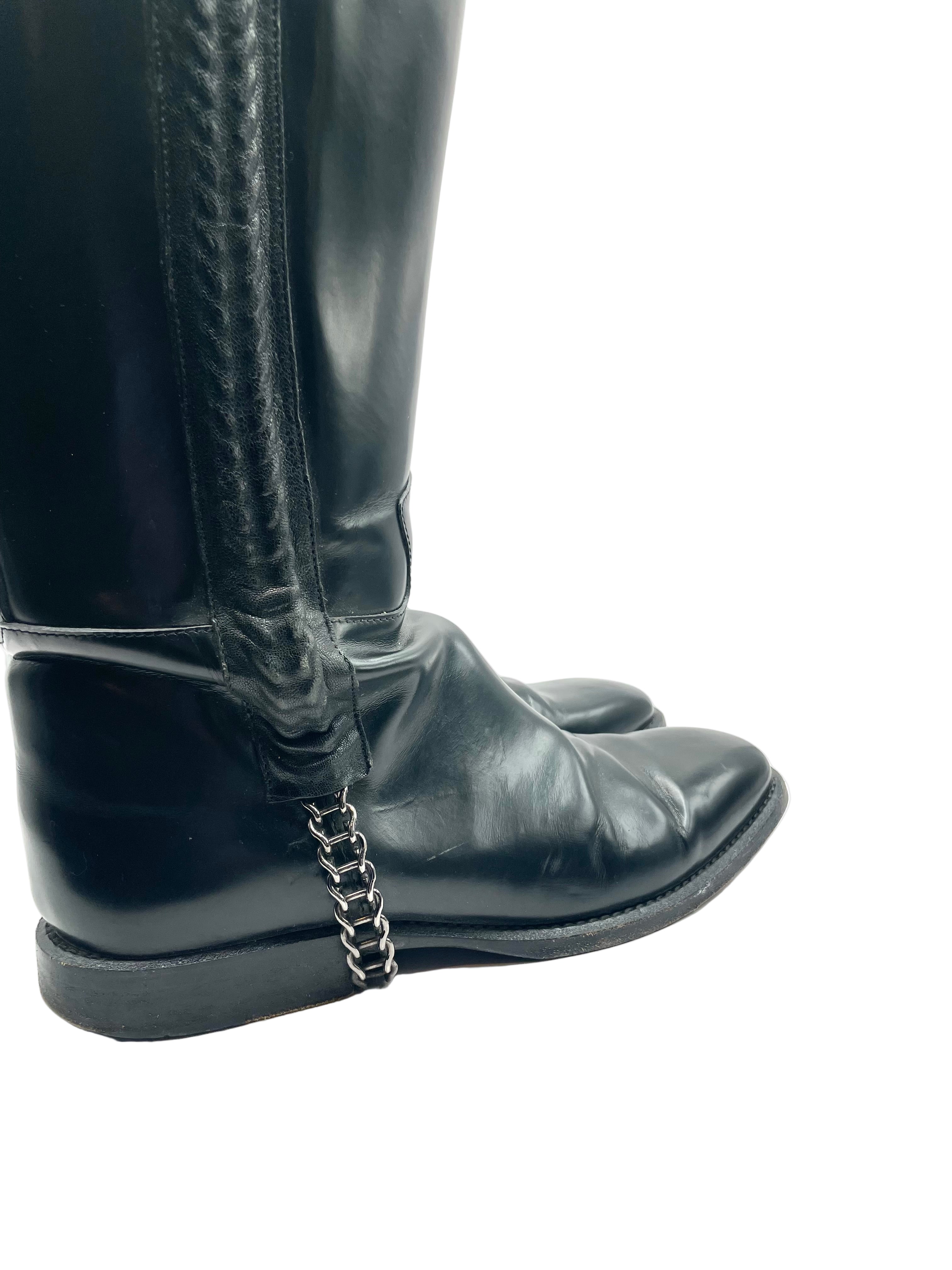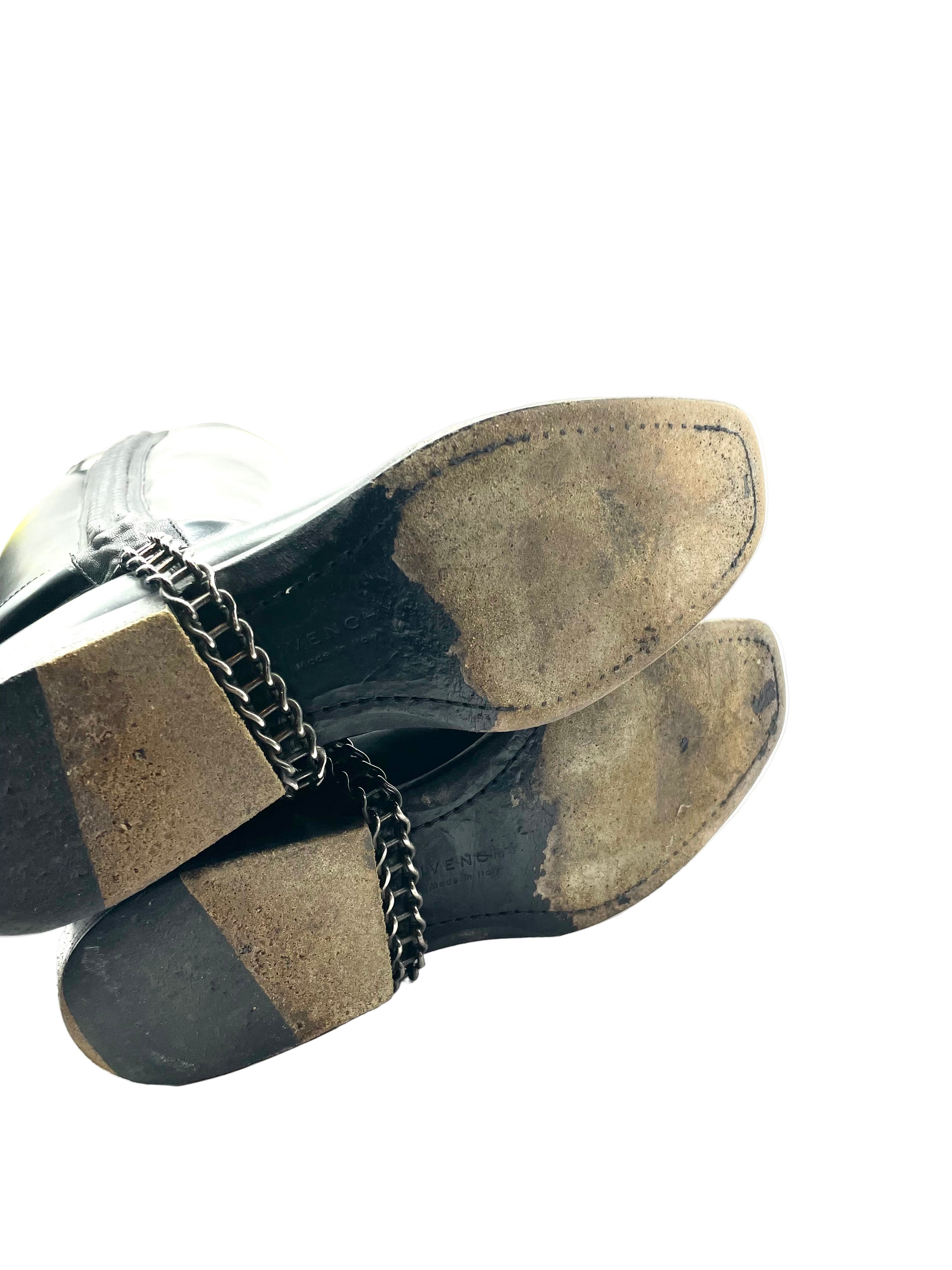 - Embellishments: The main feature is a prominent silver-tone chain-link accent that wraps around the ankle/vamp area of the boot. A subtle braided leather trim also runs vertically up the side of the shaft.