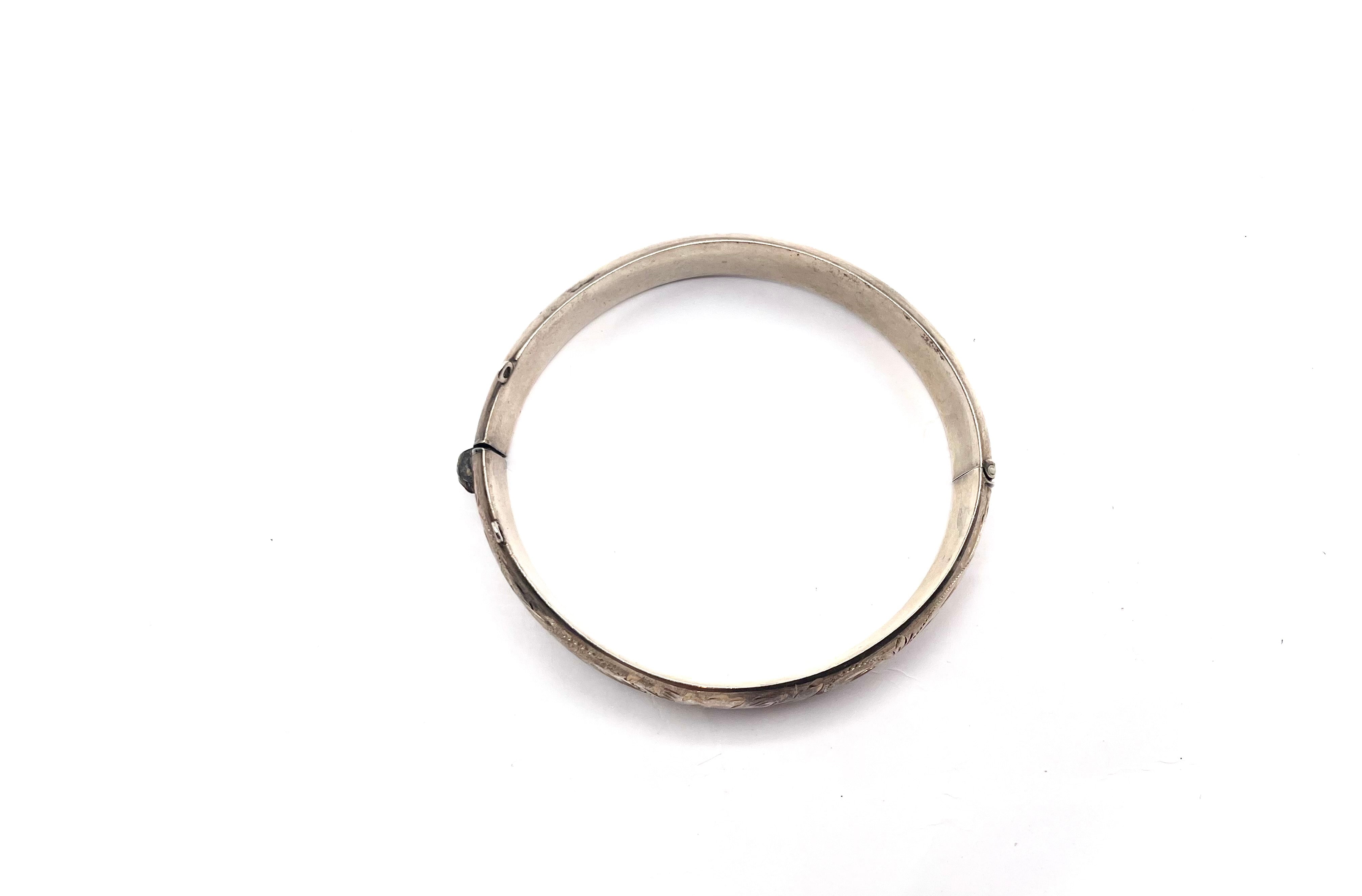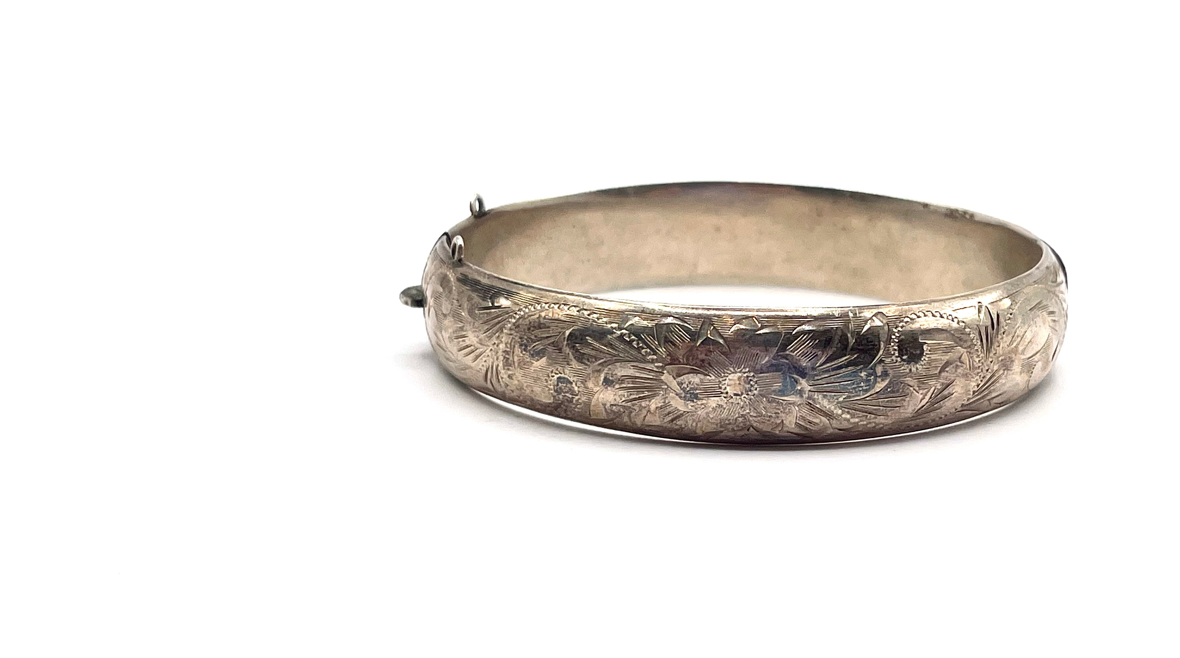 - Design: The intricate, bright-cut floral and scroll patterns cover the front half of the bangle, set against a smooth background.